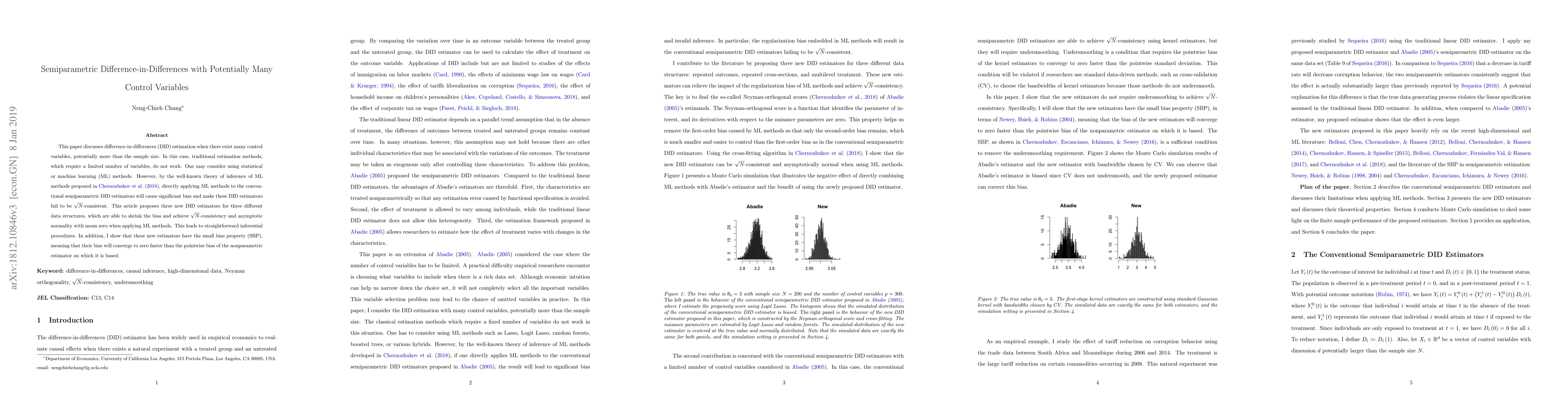 This paper proposes new semiparametric difference-in-differences (DID) estimators to handle many control variables, potentially exceeding the sample size, ensuring sqrt{N}-consistency and asymptotic normality while avoiding bias from machine learning methods. The new estimators also exhibit the small bias property (SBP).