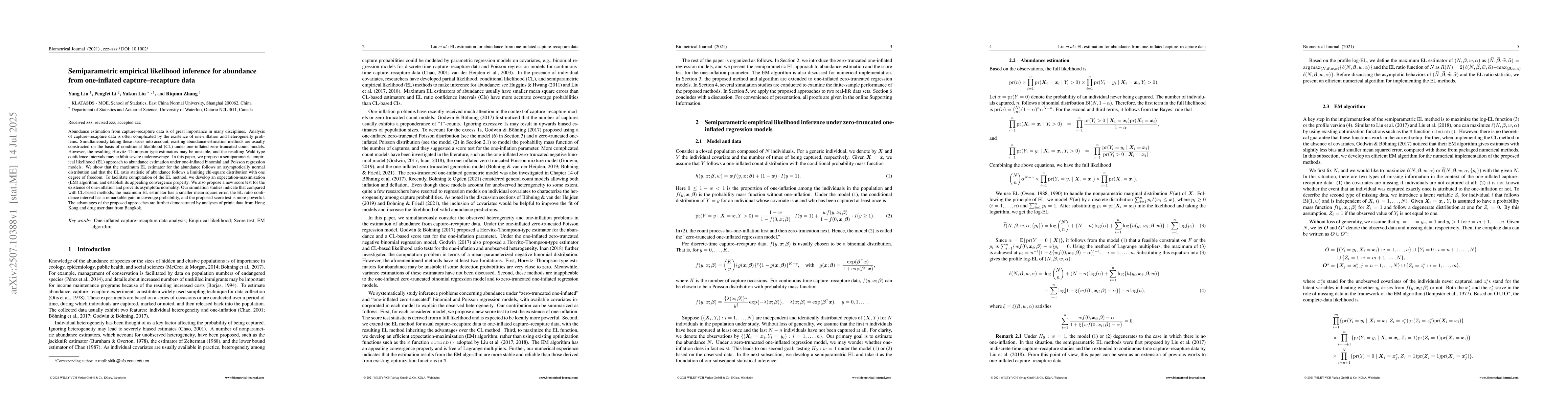 Abundance estimation from capture-recapture data is of great importance in many disciplines. Analysis of capture-recapture data is often complicated by the existence of one-inflation and heterogeneity problems. Simultaneously taking these issues into account, existing abundance estimation methods are usually constructed on the basis of conditional likelihood (CL) under one-inflated zero-truncated count models. However, the resulting Horvitz-Thompson-type estimators may be unstable, and the resulting Wald-type confidence intervals may exhibit severe undercoverage. In this paper, we propose a semiparametric empirical likelihood (EL) approach to abundance estimation under one-inflated binomial and Poisson regression models. We show that the maximum EL estimator for the abundance follows an asymptotically normal distribution and that the EL ratio statistic of abundance follows a limiting chi-square distribution with one degree of freedom. To facilitate computation of the EL method, we develop an expectation-maximization (EM) algorithm, and establish its appealing convergence property. We also propose a new score test for the existence of one-inflation and prove its asymptotic normality. Our simulation studies indicate that compared with CL-based methods, the maximum EL estimator has a smaller mean square error, the EL ratio confidence interval has a remarkable gain in coverage probability, and the proposed score test is more powerful. The advantages of the proposed approaches are further demonstrated by analyses of prinia data from Hong Kong and drug user data from Bangkok.
