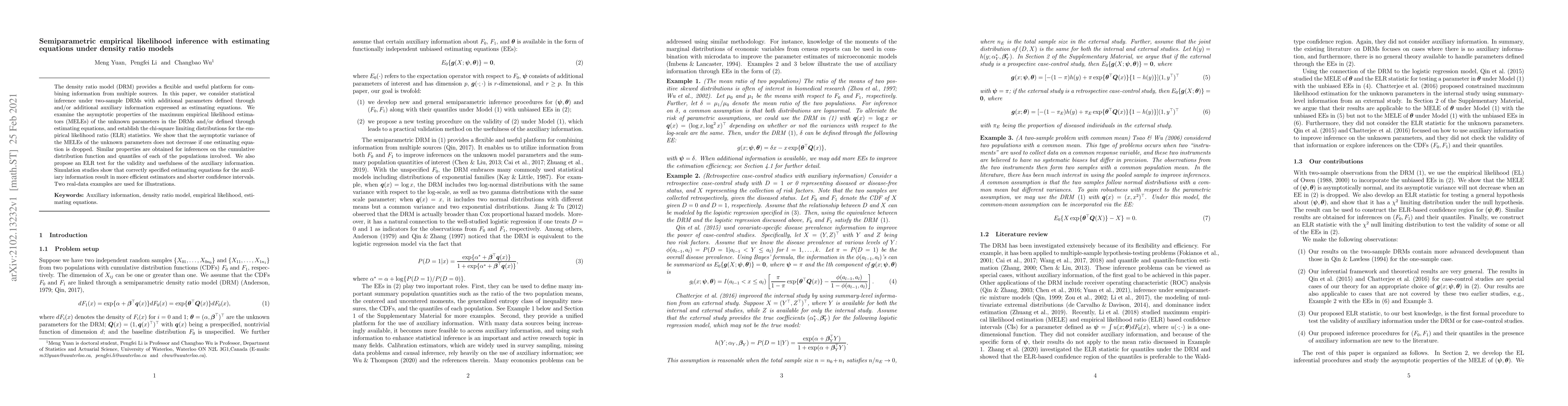 This paper develops semiparametric empirical likelihood inference for density ratio models (DRMs) under two-sample settings, incorporating additional parameters via estimating equations. It establishes the asymptotic properties of maximum empirical likelihood estimators and proposes an empirical likelihood ratio test for auxiliary information validity.