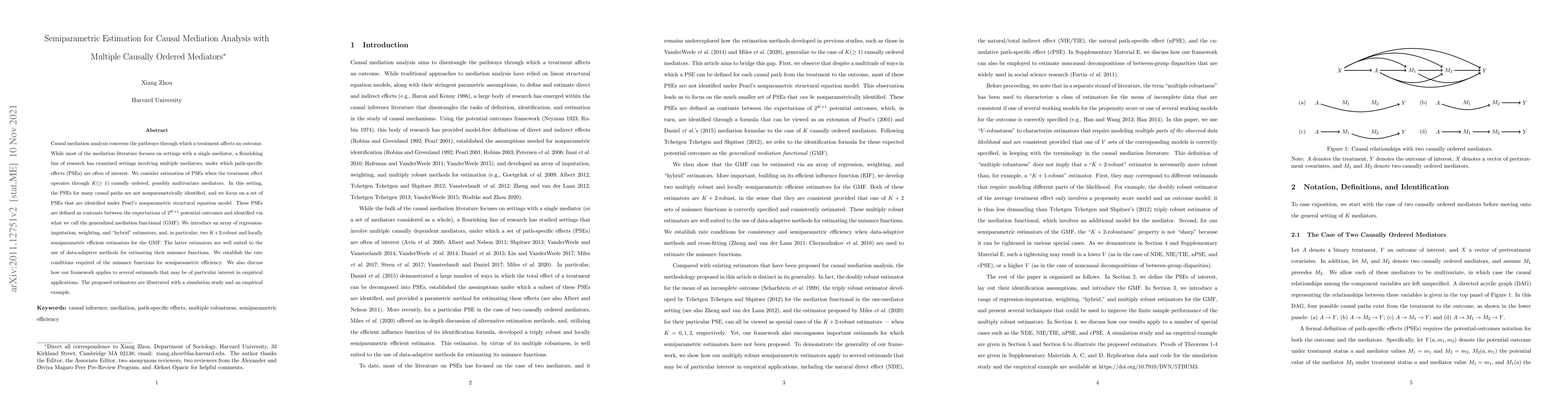 This paper develops semiparametric estimation methods for causal mediation analysis involving multiple causally ordered mediators. It introduces robust and locally semiparametric efficient estimators for path-specific effects, utilizing data-adaptive techniques for nuisance function estimation, and demonstrates the approach through simulations and an empirical example.