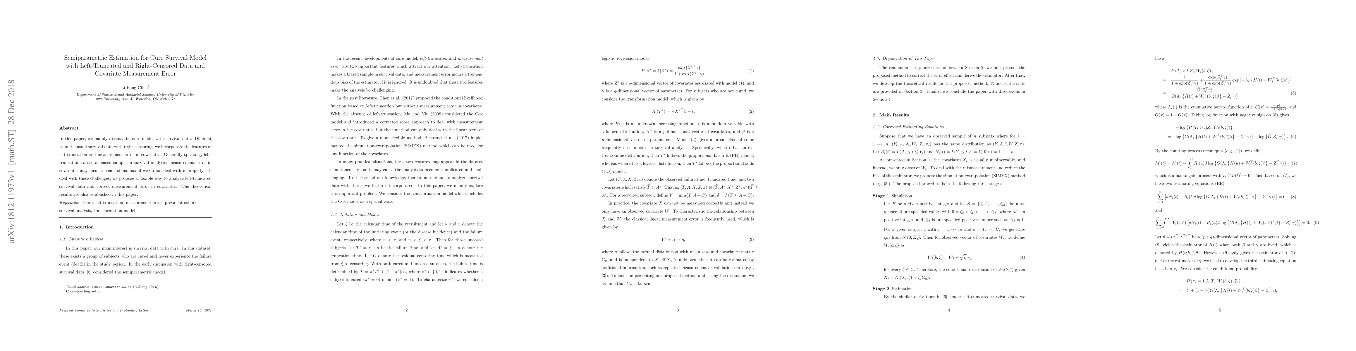 This paper proposes a semiparametric estimation method for a cure survival model that accounts for left-truncated and right-censored data, along with covariate measurement error. It addresses the biases introduced by left-truncation and measurement error and provides theoretical results to support the proposed approach.