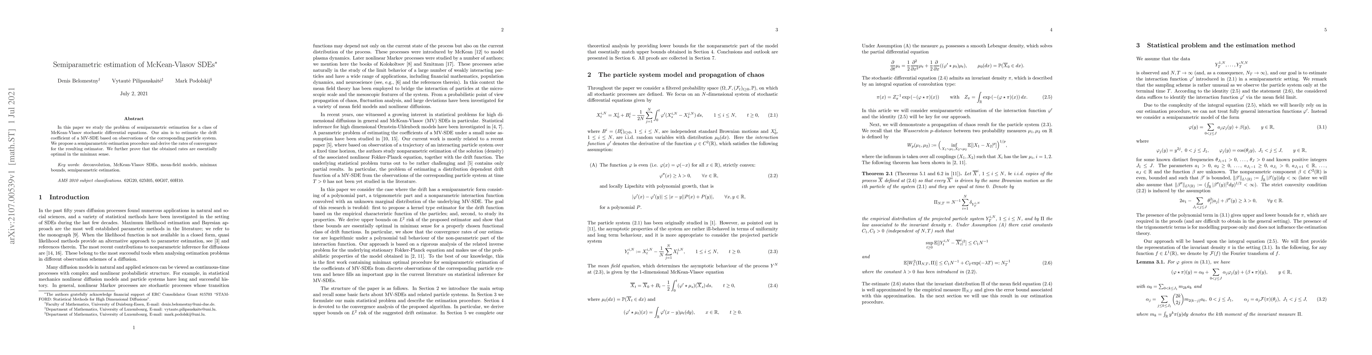 This paper proposes a semiparametric estimation method for McKean-Vlasov SDEs, focusing on estimating the drift coefficient from particle system observations. The authors derive optimal convergence rates and demonstrate the minimax optimality of their estimator.
