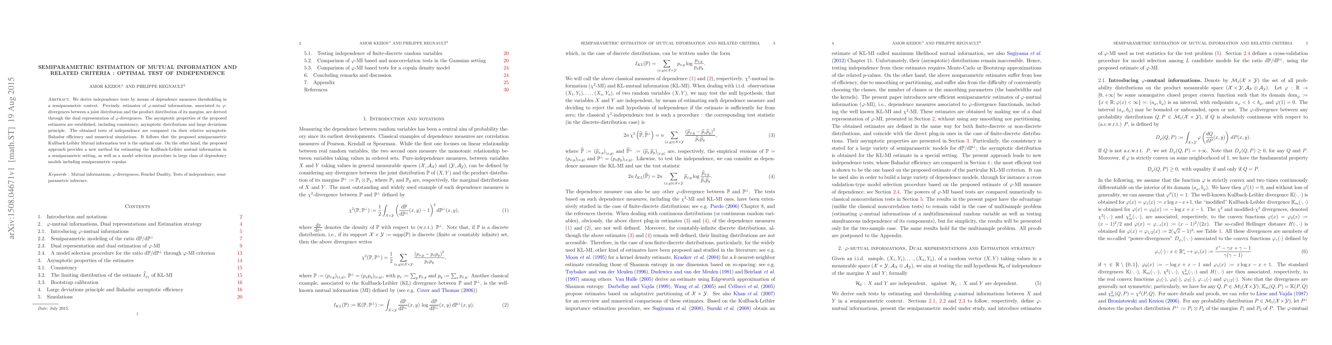 This paper develops semiparametric estimates for mutual information and proposes independence tests using phi-divergences. It establishes the asymptotic properties of these estimates and finds that the semiparametric Kullback-Leibler Mutual information test is optimal, also providing a new method for estimating mutual information and model selection in semiparametric dependency models.