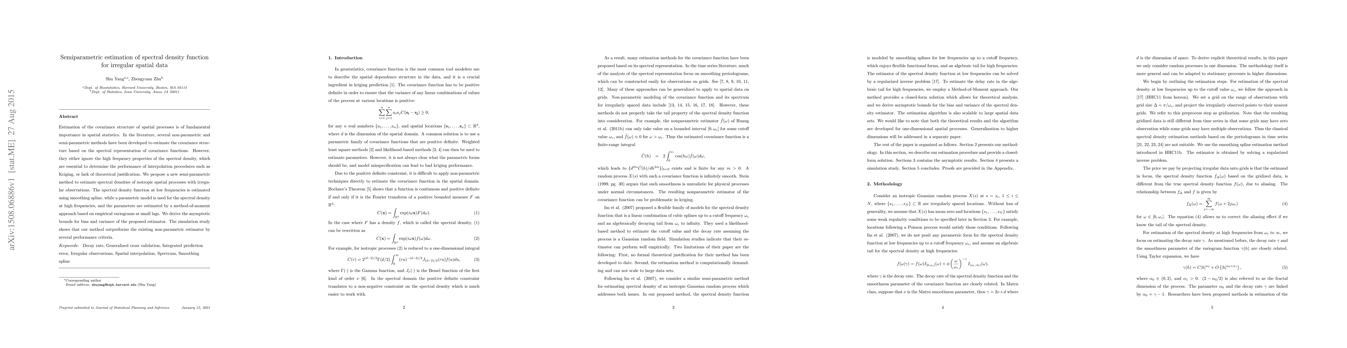 Estimation of the covariance structure of spatial processes is of fundamental importance in spatial statistics. In the literature, several non-parametric and semi-parametric methods have been developed to estimate the covariance structure based on the spectral representation of covariance functions. However,they either ignore the high frequency properties of the spectral density, which are essential to determine the performance of interpolation procedures such as Kriging, or lack of theoretical justification. We propose a new semi-parametric method to estimate spectral densities of isotropic spatial processes with irregular observations. The spectral density function at low frequencies is estimated using smoothing spline, while a parametric model is used for the spectral density at high frequencies, and the parameters are estimated by a method-of-moment approach based on empirical variograms at small lags. We derive the asymptotic bounds for bias and variance of the proposed estimator. The simulation study shows that our method outperforms the existing non-parametric estimator by several performance criteria.