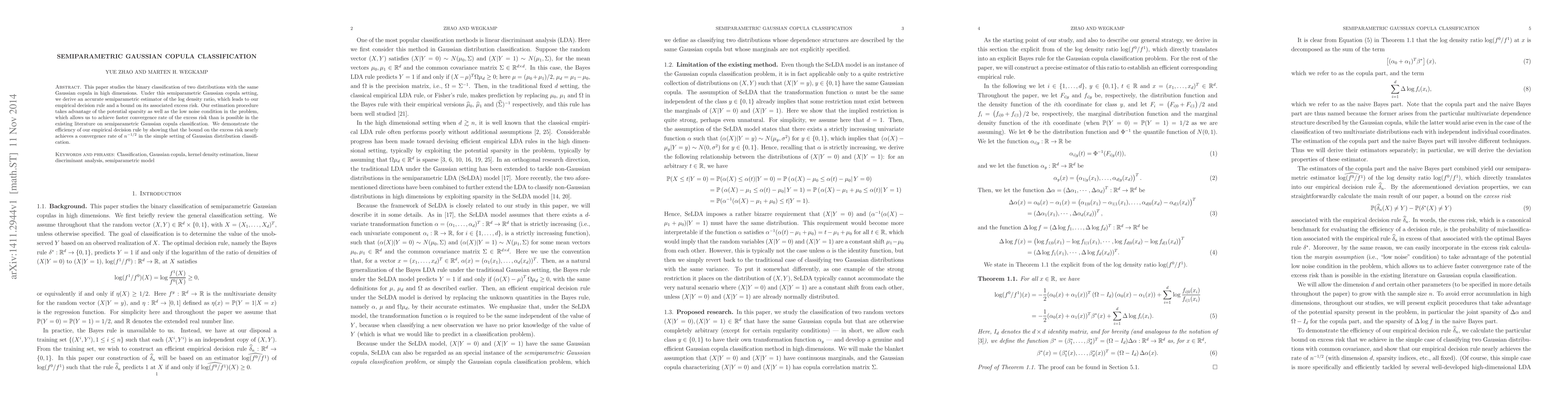 This paper proposes a semiparametric estimator for binary classification under the Gaussian copula framework, achieving faster convergence rates than existing methods by leveraging sparsity and low noise conditions. The derived empirical decision rule nearly attains a $n^{-1/2}$ convergence rate for Gaussian distribution classification.