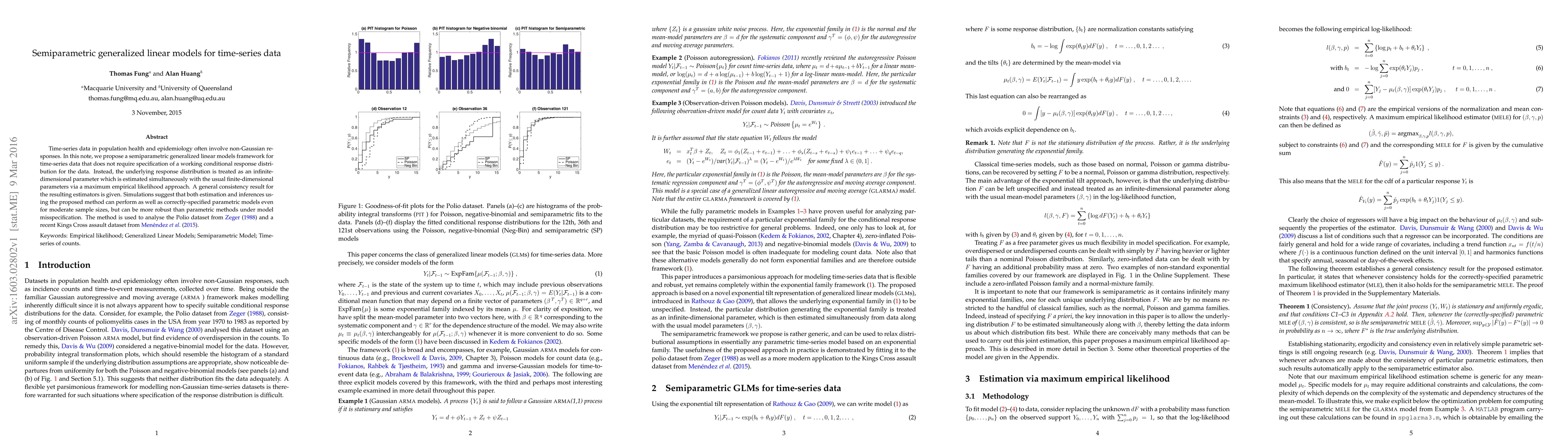This paper proposes a semiparametric generalized linear model for time-series data that avoids specifying a conditional response distribution, instead estimating the underlying distribution and parameters via maximum empirical likelihood. The method is shown to perform competitively with parametric models and is robust to misspecification, demonstrated through analyses of Polio and assault datasets.