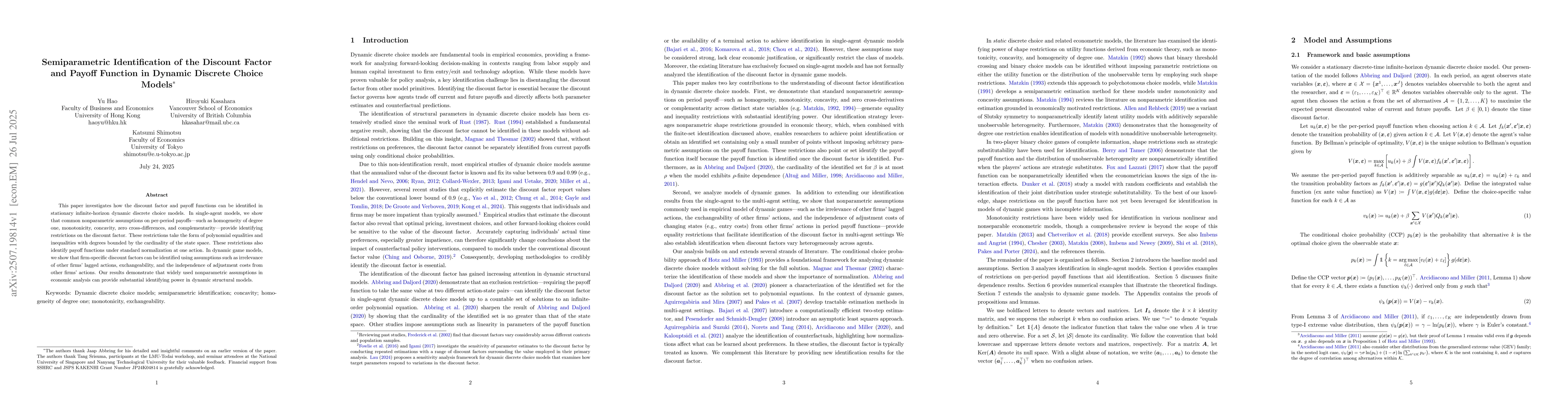 This paper investigates how the discount factor and payoff functions can be identified in stationary infinite-horizon dynamic discrete choice models. In single-agent models, we show that common nonparametric assumptions on per-period payoffs -- such as homogeneity of degree one, monotonicity, concavity, zero cross-differences, and complementarity -- provide identifying restrictions on the discount factor. These restrictions take the form of polynomial equalities and inequalities with degrees bounded by the cardinality of the state space. These restrictions also identify payoff functions under standard normalization at one action. In dynamic game models, we show that firm-specific discount factors can be identified using assumptions such as irrelevance of other firms' lagged actions, exchangeability, and the independence of adjustment costs from other firms' actions. Our results demonstrate that widely used nonparametric assumptions in economic analysis can provide substantial identifying power in dynamic structural models.