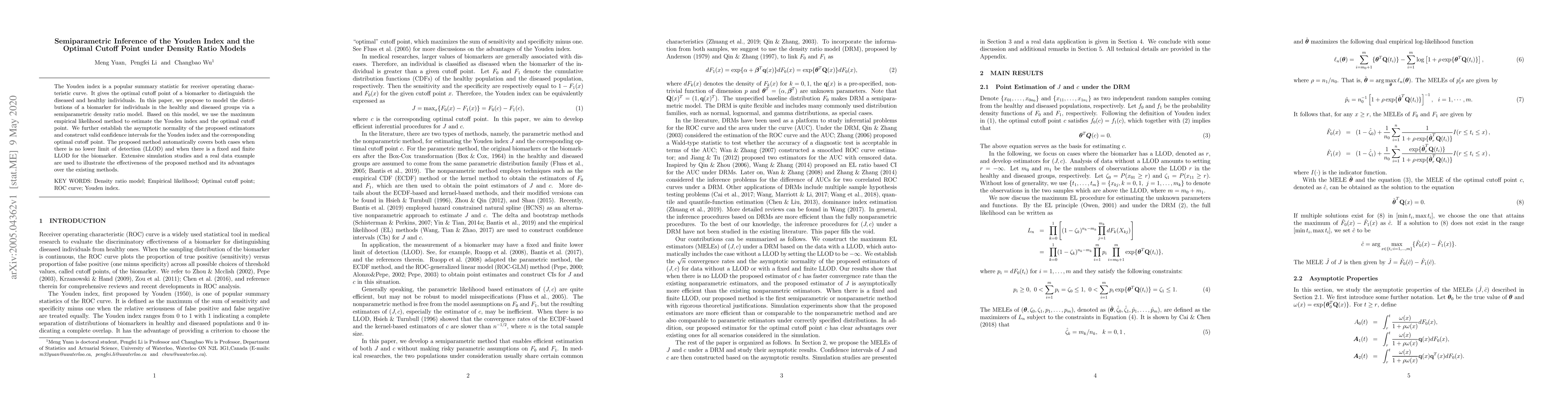 This paper proposes a semiparametric density ratio model to estimate the Youden index and optimal cutoff point for distinguishing diseased from healthy individuals using a biomarker. The method employs maximum empirical likelihood and establishes asymptotic normality, providing valid confidence intervals. The approach is shown to be effective in both LLOD-free and LLOD-constrained scenarios through simulations and real data analysis.