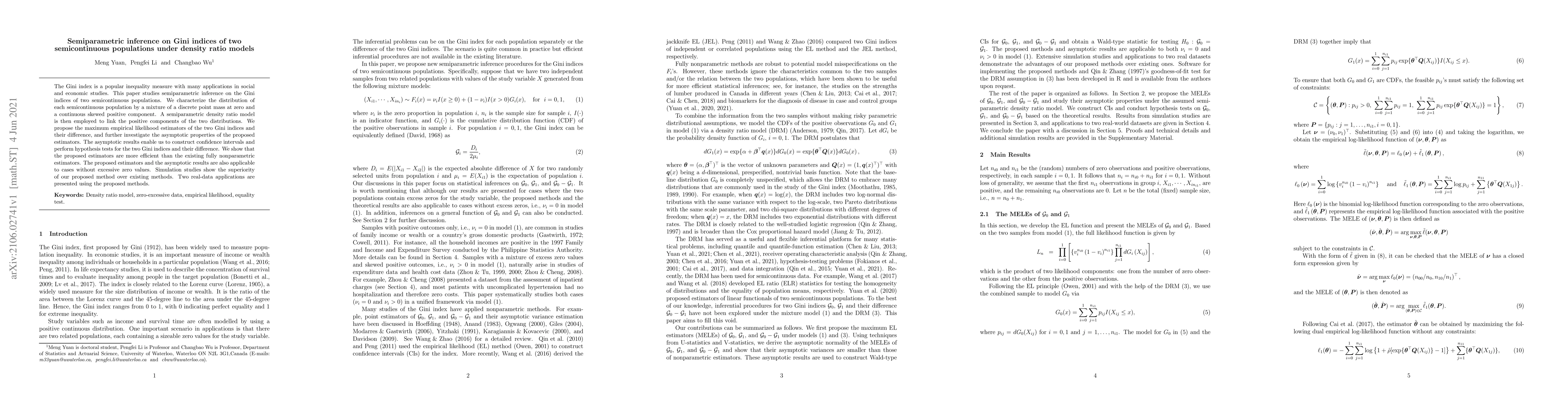 This paper develops semiparametric inference methods for Gini indices of two semicontinuous populations using a density ratio model. It proposes maximum empirical likelihood estimators for the Gini indices and their difference, demonstrating improved efficiency over fully nonparametric estimators, and applies the method to real-data examples.