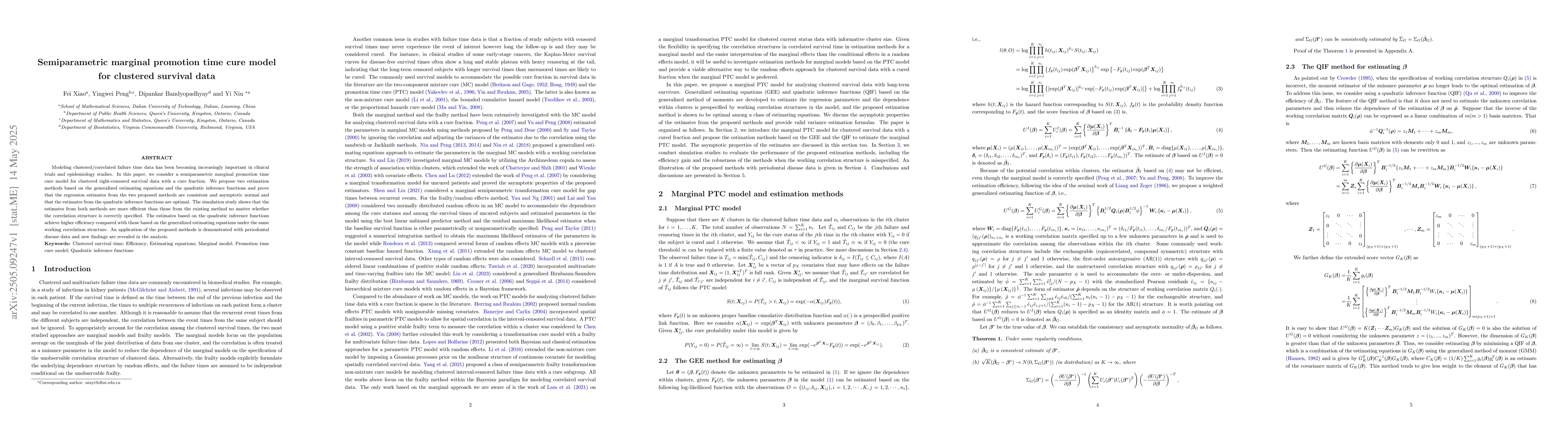 The paper proposes a semiparametric marginal promotion time cure model for clustered right-censored survival data with a cure fraction, introducing two estimation methods based on generalized estimating equations (GEE) and quadratic inference functions (QIF).