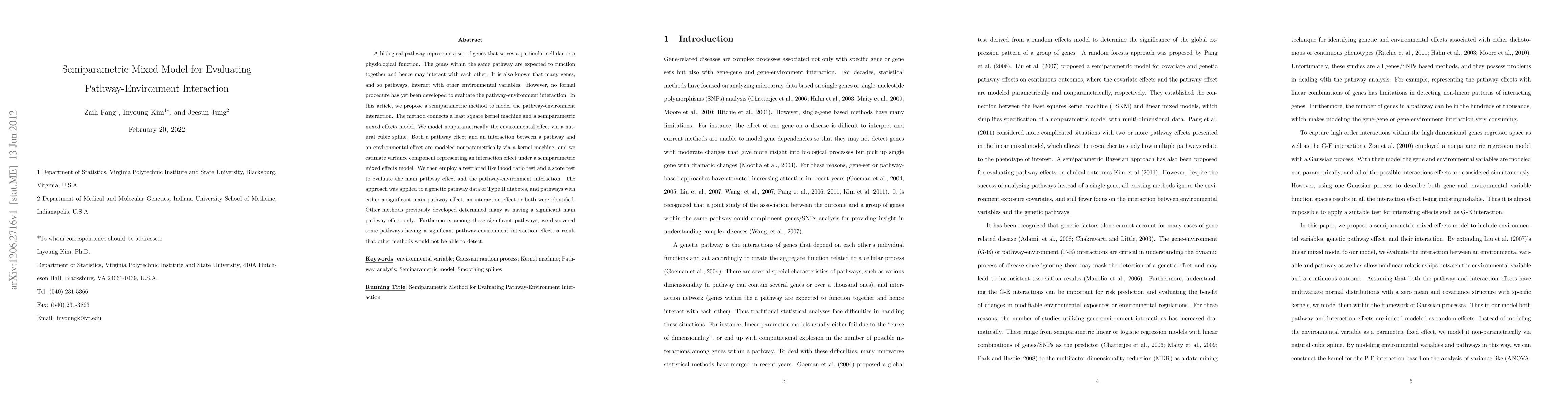 This paper proposes a semiparametric mixed model to evaluate pathway-environment interactions, combining a least square kernel machine and a semiparametric mixed effects model to model environmental and pathway effects nonparametrically. The method identifies pathways with significant main effects and interactions in Type II diabetes data, revealing interactions undetected by previous methods.