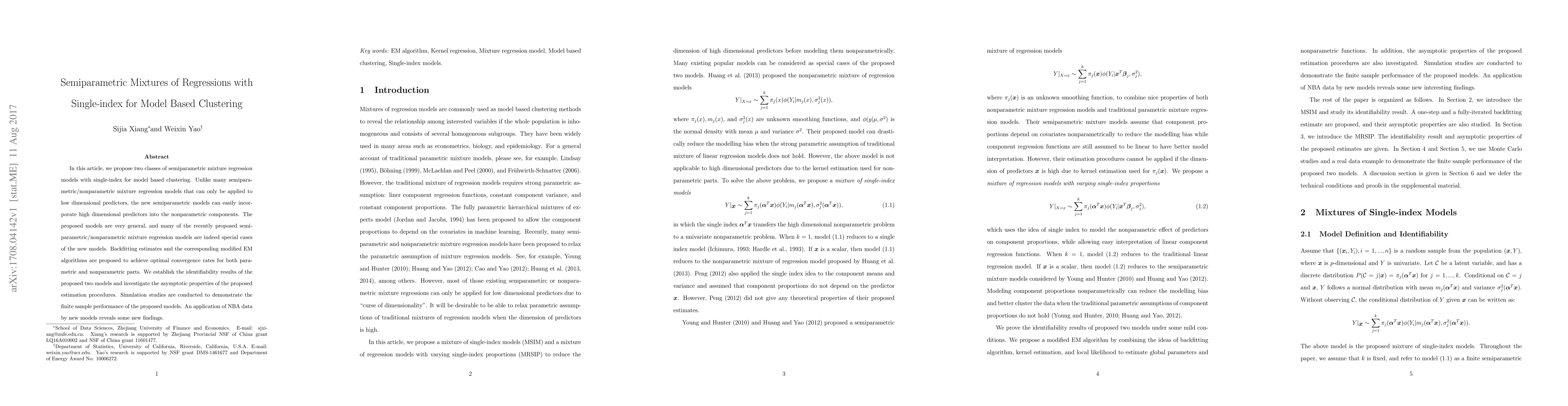 This paper introduces two classes of semiparametric mixture regression models with single-index for model-based clustering, capable of handling high-dimensional predictors. The proposed models generalize existing methods and utilize backfitting estimates and modified EM algorithms for optimal convergence rates.