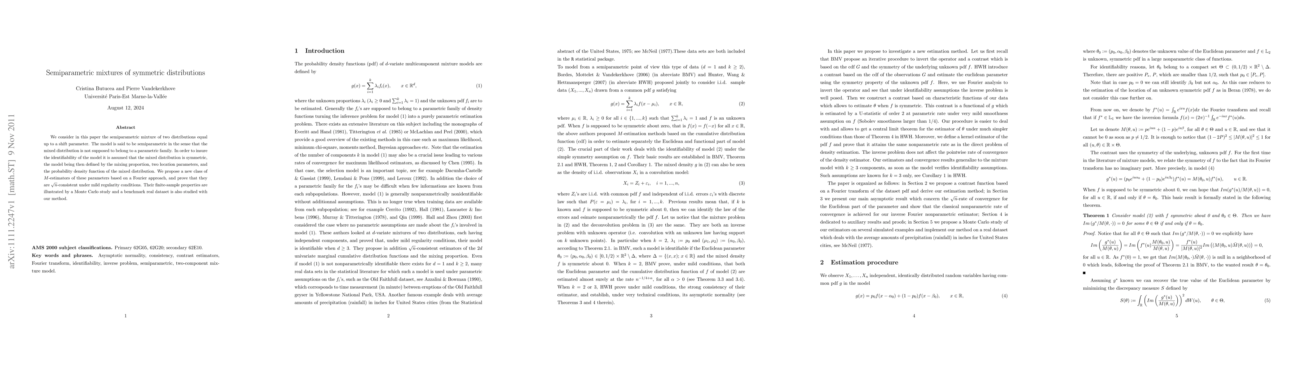 We consider in this paper the semiparametric mixture of two distributions equal up to a shift parameter. The model is said to be semiparametric in the sense that the mixed distribution is not supposed to belong to a parametric family. In order to insure the identifiability of the model it is assumed that the mixed distribution is symmetric, the model being then defined by the mixing proportion, two location parameters, and the probability density function of the mixed distribution. We propose a new class of M-estimators of these parameters based on a Fourier approach, and prove that they are square root consistent under mild regularity conditions. Their finite-sample properties are illustrated by a Monte Carlo study and a benchmark real dataset is also studied with our method.