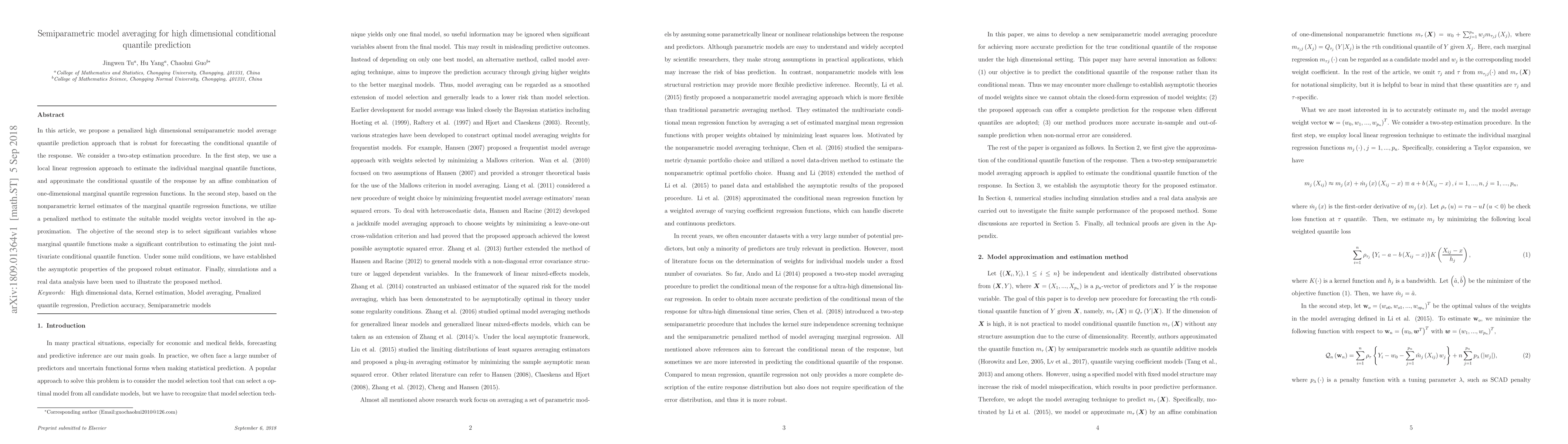 This paper proposes a penalized semiparametric model averaging method for high-dimensional conditional quantile prediction. It uses a two-step procedure: local linear regression for marginal quantile functions and a penalized method for estimating model weights, followed by simulations and real data analysis to validate the approach.