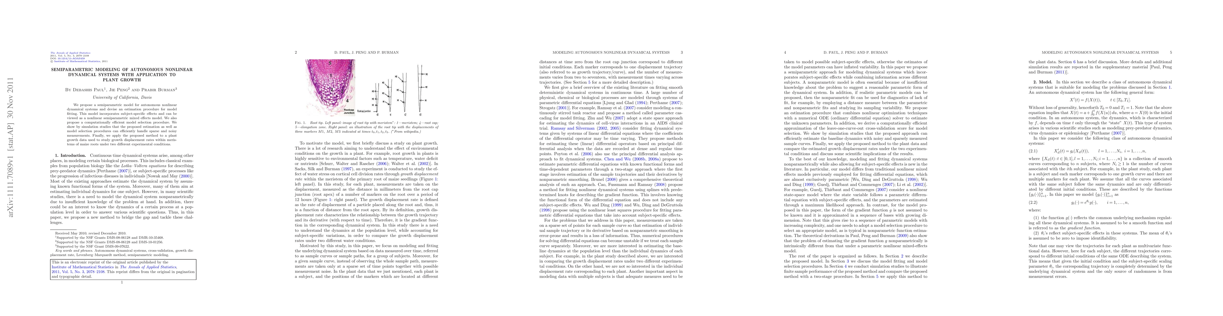 This paper introduces a semiparametric model for autonomous nonlinear dynamical systems, incorporating subject-specific effects, and presents an efficient estimation and model selection procedure. The method is applied to plant growth data to study growth displacement rates in maize roots under different conditions.