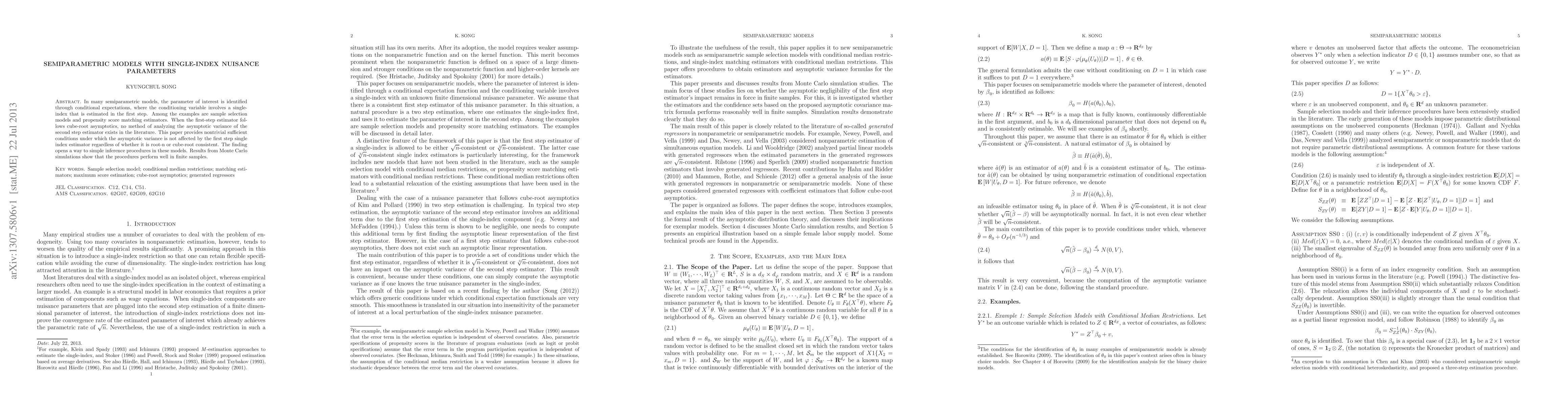 In many semiparametric models, the parameter of interest is identified through conditional expectations, where the conditioning variable involves a single-index that is estimated in the first step. Among the examples are sample selection models and propensity score matching estimators. When the first-step estimator follows cube-root asymptotics, no method of analyzing the asymptotic variance of the second step estimator exists in the literature. This paper provides nontrivial sufficient conditions under which the asymptotic variance is not affected by the first step single index estimator regardless of whether it is root-n or cube-root consistent. The finding opens a way to simple inference procedures in these models. Results from Monte Carlo simulations show that the procedures perform well in finite samples.