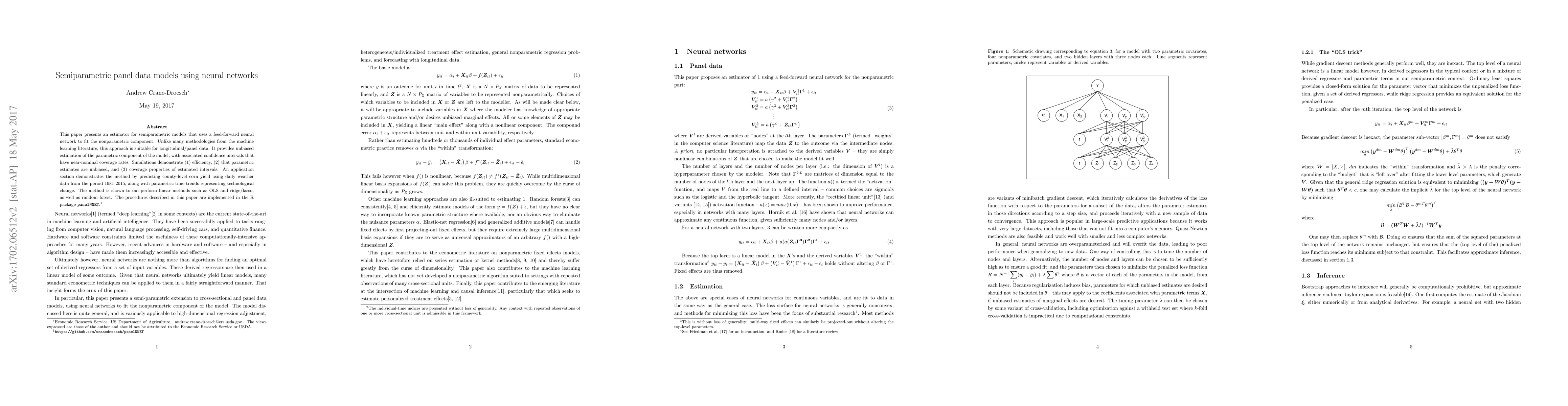 This paper presents an estimator for semiparametric models that uses a feed-forward neural network to fit the nonparametric component. Unlike many methodologies from the machine learning literature, this approach is suitable for longitudinal/panel data. It provides unbiased estimation of the parametric component of the model, with associated confidence intervals that have near-nominal coverage rates. Simulations demonstrate (1) efficiency, (2) that parametric estimates are unbiased, and (3) coverage properties of estimated intervals. An application section demonstrates the method by predicting county-level corn yield using daily weather data from the period 1981-2015, along with parametric time trends representing technological change. The method is shown to out-perform linear methods such as OLS and ridge/lasso, as well as random forest. The procedures described in this paper are implemented in the R package panelNNET.