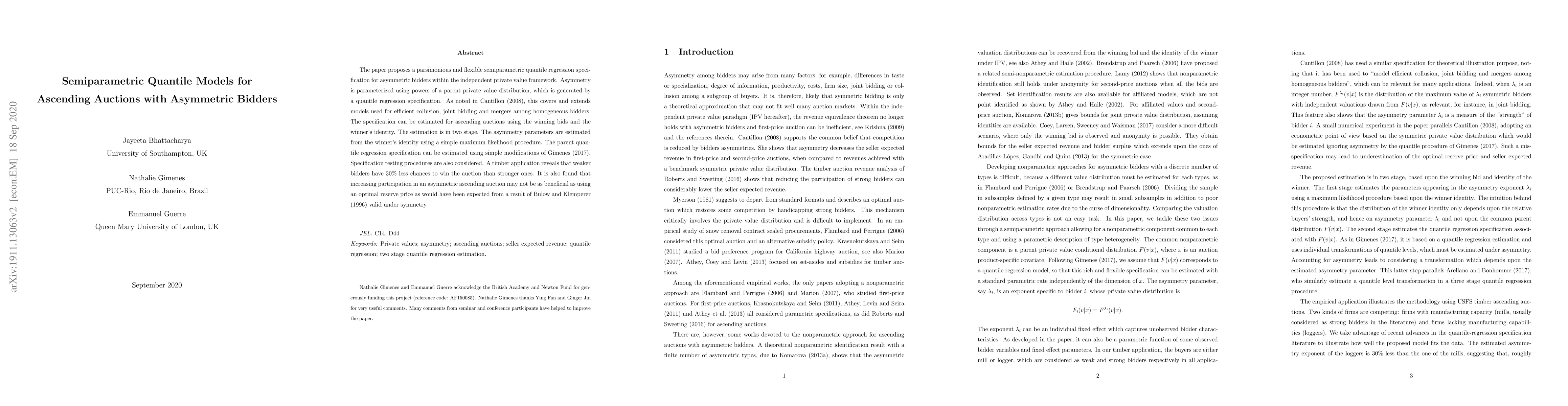 This paper introduces a semiparametric quantile regression model for ascending auctions with asymmetric bidders, estimating asymmetry through a quantile regression specification. The model reveals that weaker bidders have significantly lower chances of winning, challenging traditional auction theory predictions.
