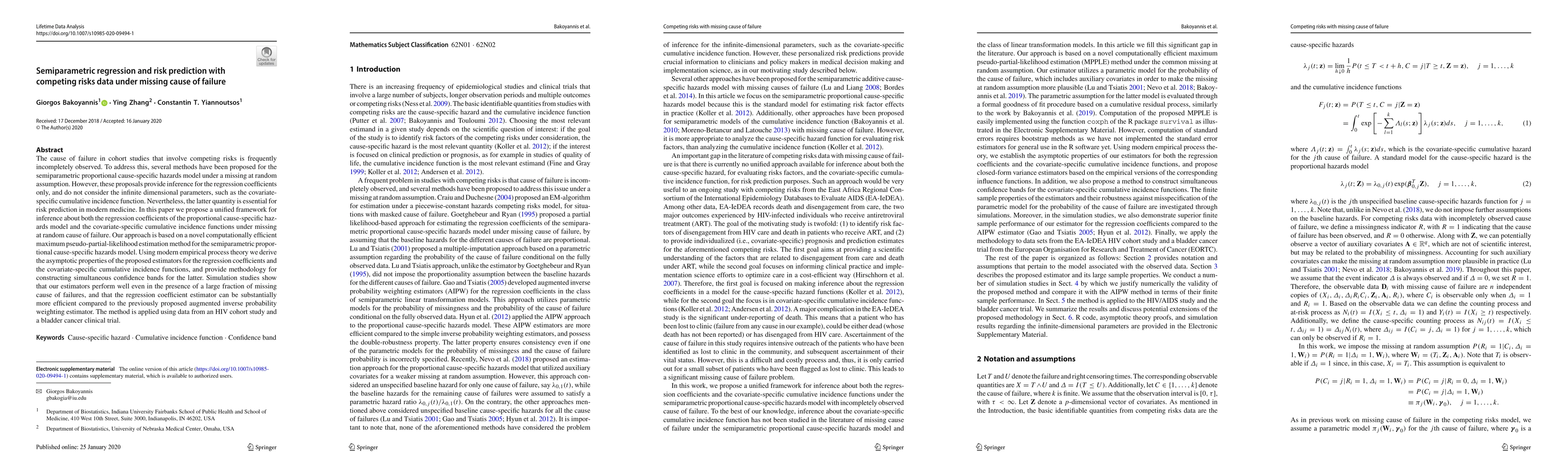 This paper proposes a novel framework for semiparametric regression and risk prediction in cohort studies with competing risks and missing cause of failure. It introduces a new computationally efficient estimation method and provides simultaneous confidence bands for covariate-specific cumulative incidence functions, demonstrating improved efficiency and performance in simulations and applications to HIV and bladder cancer studies.