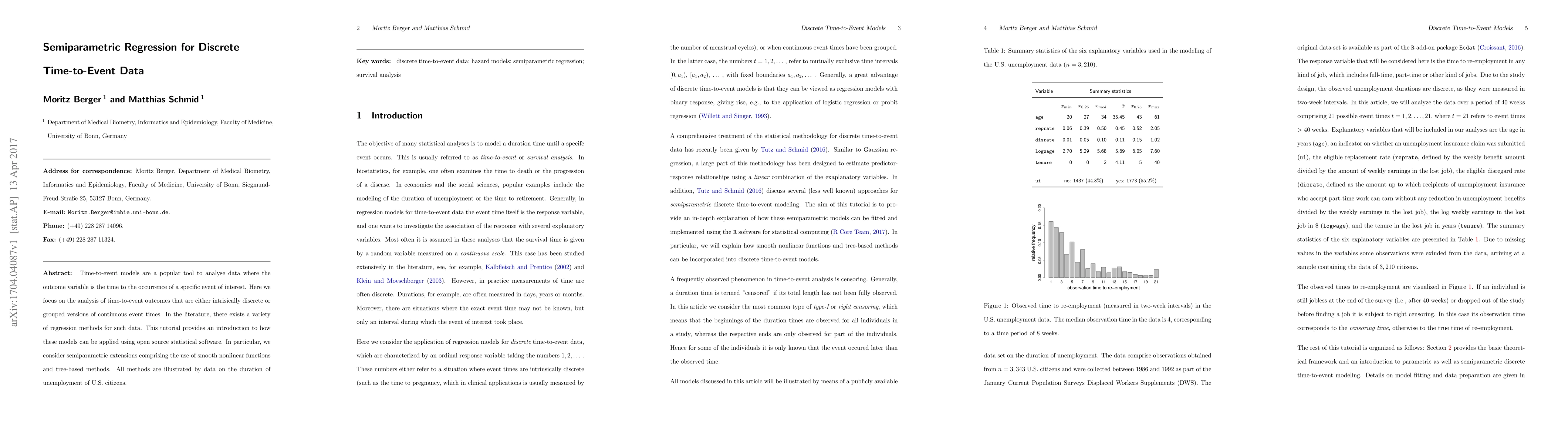 This paper introduces semiparametric regression methods for analyzing discrete time-to-event data, employing smooth nonlinear functions and tree-based techniques. It demonstrates these approaches using open source software and applies them to unemployment duration data from U.S. citizens.