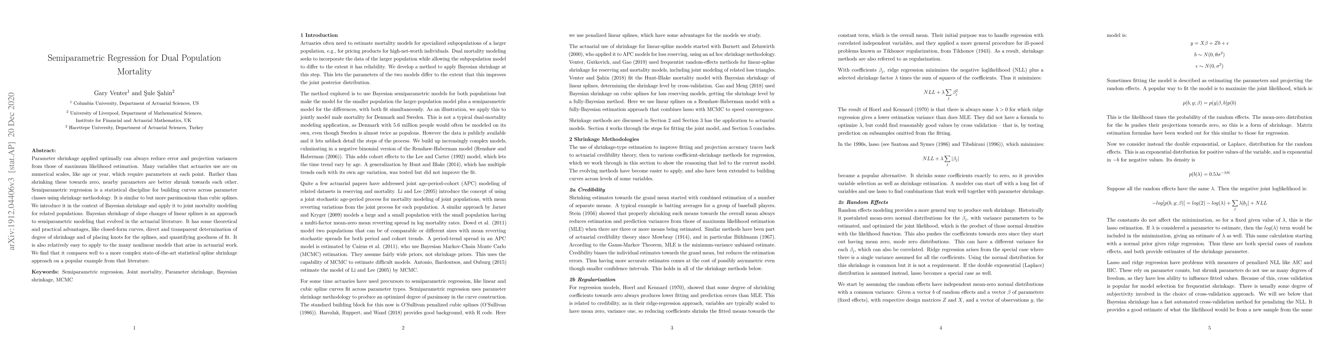 This paper introduces semiparametric regression for dual population mortality modeling, emphasizing Bayesian shrinkage techniques that shrink parameters towards each other rather than towards zero. The method is shown to compare favorably to more complex spline shrinkage approaches in terms of error reduction and model fit.