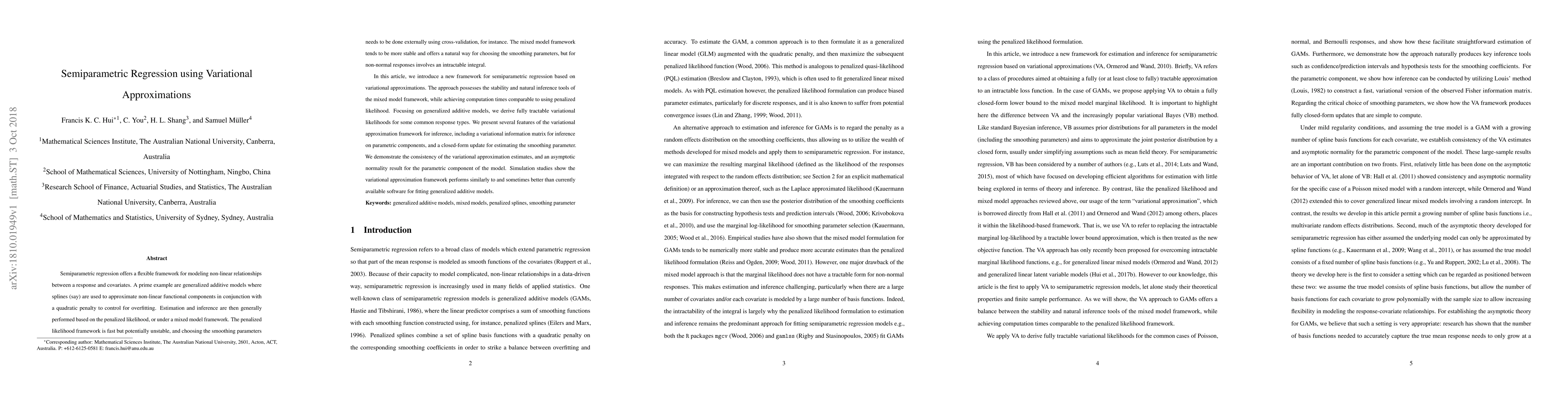 This paper introduces a new variational approximation framework for semiparametric regression, combining the stability and inference tools of mixed models with the computational efficiency of penalized likelihood. The approach is demonstrated to perform well in simulation studies for generalized additive models.