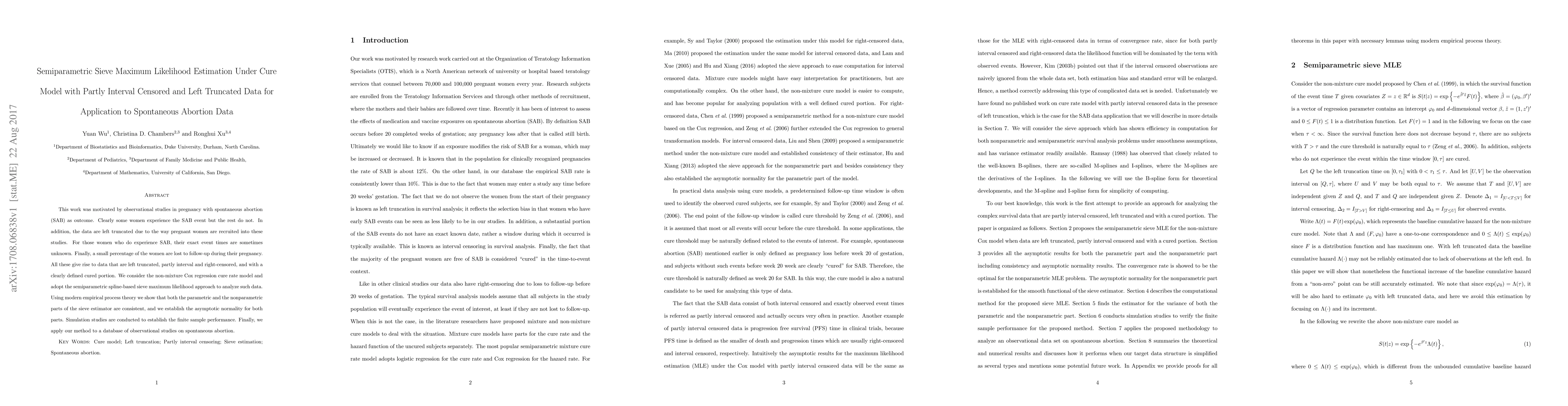This paper develops a semiparametric sieve maximum likelihood estimation method for analyzing cure models with partly interval censored and left truncated data, specifically applied to spontaneous abortion studies. The proposed method ensures consistency and asymptotic normality for both parametric and nonparametric parts, and is validated through simulation studies and an application to SAB data.