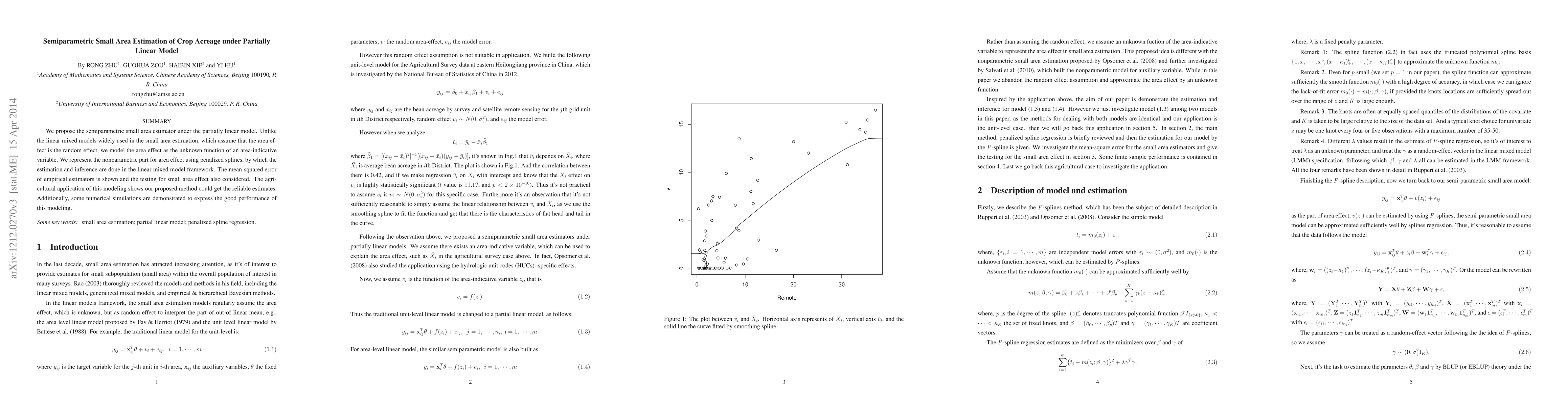 This paper proposes a semiparametric approach for small area estimation of crop acreage using a partially linear model, where the small area effect is modeled as an unknown function of an area-indicative variable. The method employs penalized splines for the nonparametric part and demonstrates good performance through numerical simulations.