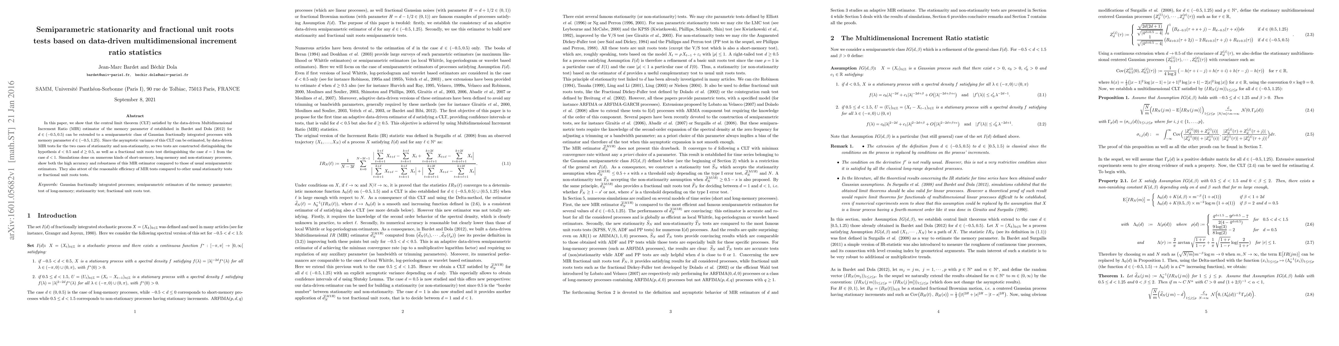 In this paper, we show that the central limit theorem (CLT) satisfied by the data-driven Multidimensional Increment Ratio (MIR) estimator of the memory parameter d established in Bardet and Dola (2012) for d $\in$ (--0.5, 0.5) can be extended to a semiparametric class of Gaussian fractionally integrated processes with memory parameter d $\in$ (--0.5, 1.25). Since the asymptotic variance of this CLT can be estimated, by data-driven MIR tests for the two cases of stationarity and non-stationarity, so two tests are constructed distinguishing the hypothesis d \textless{} 0.5 and d $\ge$ 0.5, as well as a fractional unit roots test distinguishing the case d = 1 from the case d \textless{} 1. Simulations done on numerous kinds of short-memory, long-memory and non-stationary processes, show both the high accuracy and robustness of this MIR estimator compared to those of usual semiparametric estimators. They also attest of the reasonable efficiency of MIR tests compared to other usual stationarity tests or fractional unit roots tests. Keywords: Gaussian fractionally integrated processes; semiparametric estimators of the memory parameter; test of long-memory; stationarity test; fractional unit roots test.