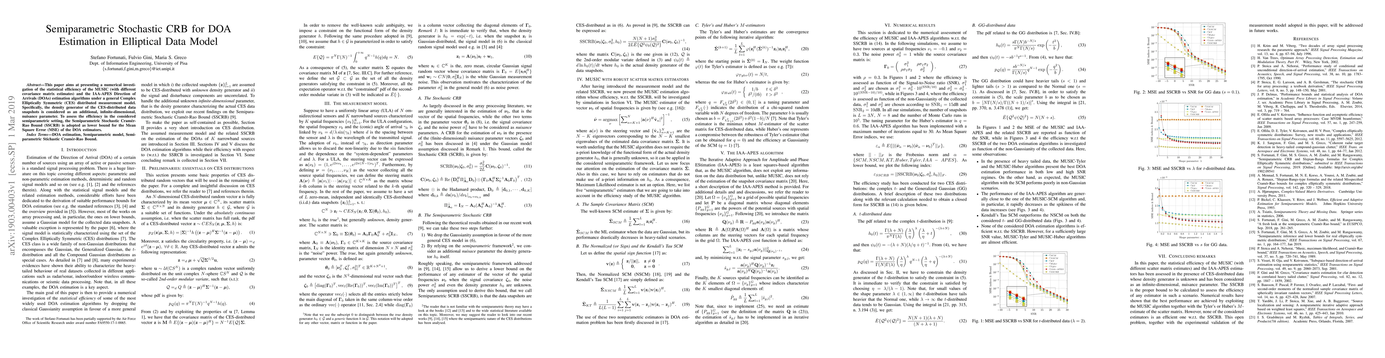 This paper explores the statistical efficiency of MUSIC and IAA-APES algorithms for DOA estimation under a Complex Elliptically Symmetric distributed model, using the Semiparametric Stochastic Cramér-Rao Bound (SSCRB) as a lower bound for Mean Square Error (MSE).