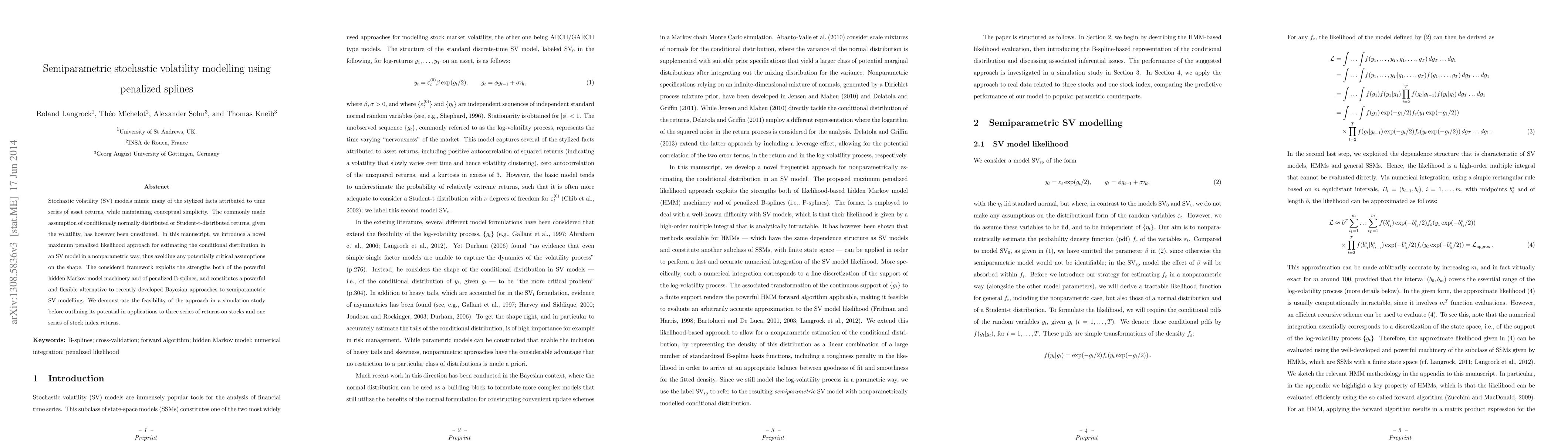 This paper proposes a novel semiparametric stochastic volatility model using penalized splines to estimate the conditional distribution without making assumptions about its shape. The method combines the flexibility of penalized B-splines with the simplicity of hidden Markov models, offering a powerful alternative to Bayesian semiparametric approaches. The approach is demonstrated through simulations and applied to stock and stock index return series.