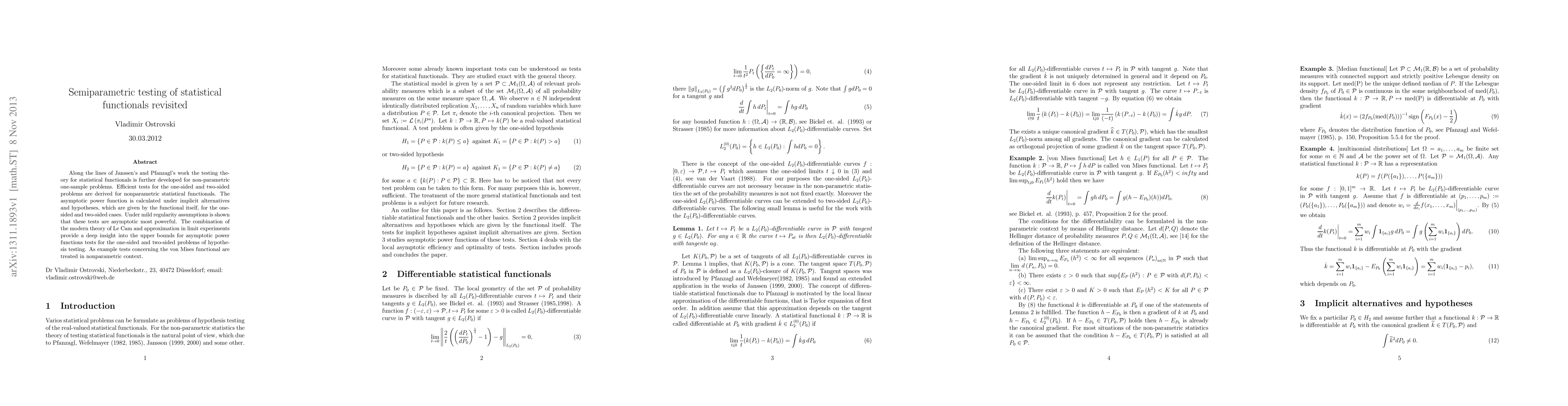 Along the lines of Janssen's and Pfanzagl's work the testing theory for statistical functionals is further developed for non-parametric one-sample problems. Efficient tests for the one-sided and two-sided problems are derived for nonparametric statistical functionals. The asymptotic power function is calculated under implicit alternatives and hypotheses, which are given by the functional itself, for the one- sided and two-sided cases. Under mild regularity assumptions it is shown that these tests are asymptotic most powerful. The combination of the modern theory of Le Cam and approximation in limit experiments provide a deep insight into the upper bounds for asymptotic power functions of tests for the one-sided and two-sided problems. As example tests based on the von Mises functional are treated in nonparametric context.