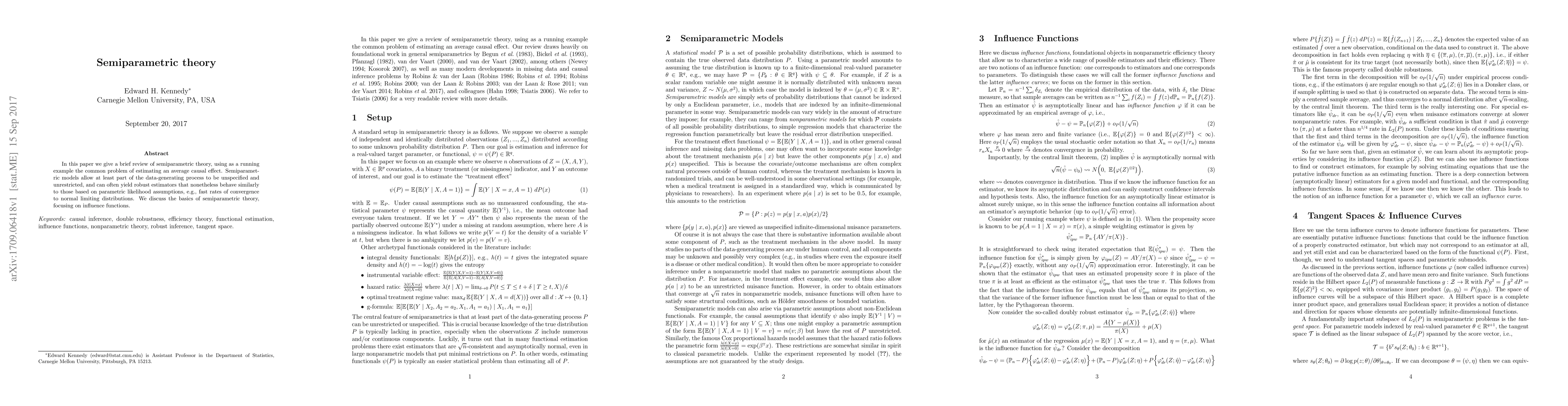 In this paper we give a brief review of semiparametric theory, using as a running example the common problem of estimating an average causal effect. Semiparametric models allow at least part of the data-generating process to be unspecified and unrestricted, and can often yield robust estimators that nonetheless behave similarly to those based on parametric likelihood assumptions, e.g., fast rates of convergence to normal limiting distributions. We discuss the basics of semiparametric theory, focusing on influence functions.