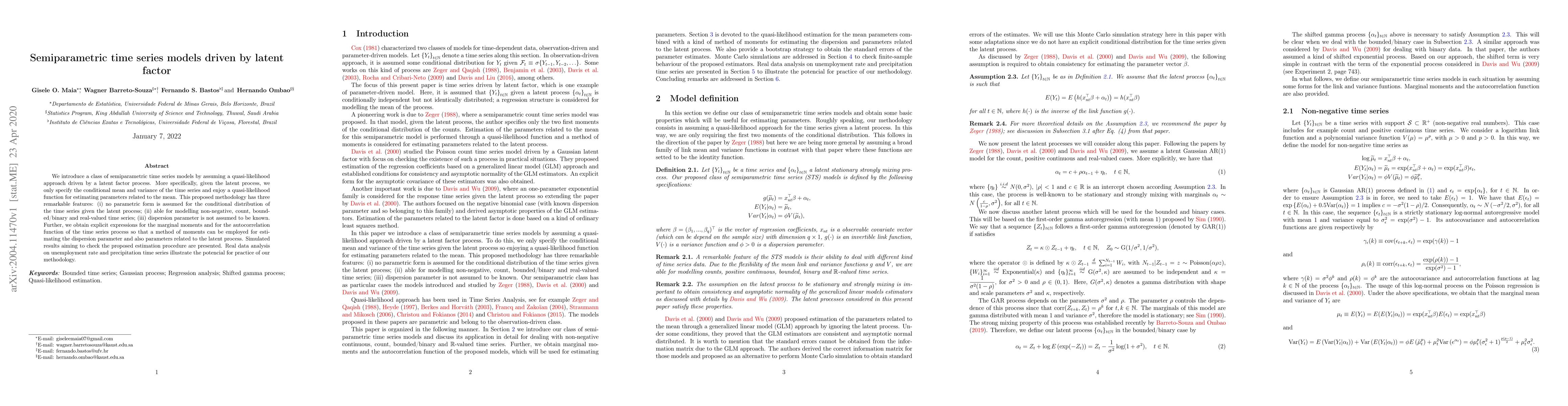 This paper proposes semiparametric time series models driven by latent factor processes, allowing for flexible modeling of various data types without assuming a specific distribution form. The method estimates parameters using a quasi-likelihood approach and demonstrates its application through simulations and real-world data analysis.