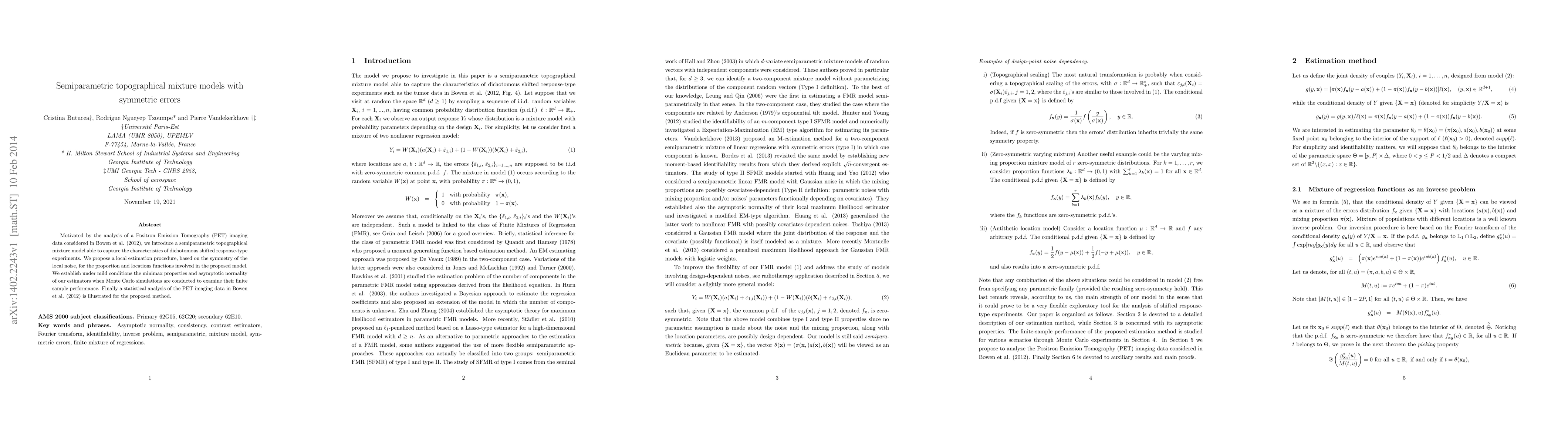 Motivated by the analysis of a Positron Emission Tomography (PET) imaging data considered in Bowen et al. (2012), we introduce a semiparametric topographical mixture model able to capture the characteristics of dichotomous shifted response-type experiments. We propose a local estimation procedure, based on the symmetry of the local noise, for the proportion and locations functions involved in the proposed model. We establish under mild conditions the minimax properties and asymptotic normality of our estimators when Monte Carlo simulations are conducted to examine their finite sample performance. Finally a statistical analysis of the PET imaging data in Bowen et al. (2012) is illustrated for the proposed method.