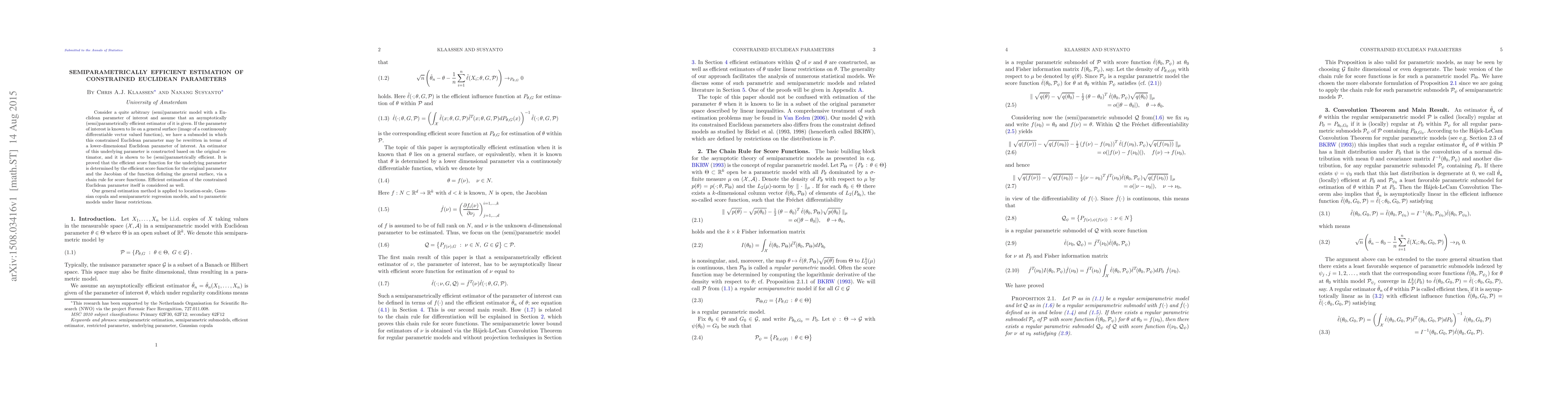 Consider a quite arbitrary (semi)parametric model with a Euclidean parameter of interest and assume that an asymptotically (semi)parametrically efficient estimator of it is given. If the parameter of interest is known to lie on a general surface (image of a continuously differentiable vector valued function), we have a submodel in which this constrained Euclidean parameter may be rewritten in terms of a lower-dimensional Euclidean parameter of interest. An estimator of this underlying parameter is constructed based on the original estimator, and it is shown to be (semi)parametrically efficient. It is proved that the efficient score function for the underlying parameter is determined by the efficient score function for the original parameter and the Jacobian of the function defining the general surface, via a chain rule for score functions. Efficient estimation of the constrained Euclidean parameter itself is considered as well. Our general estimation method is applied to location-scale, Gaussian copula and semiparametric regression models, and to parametric models under linear restrictions.