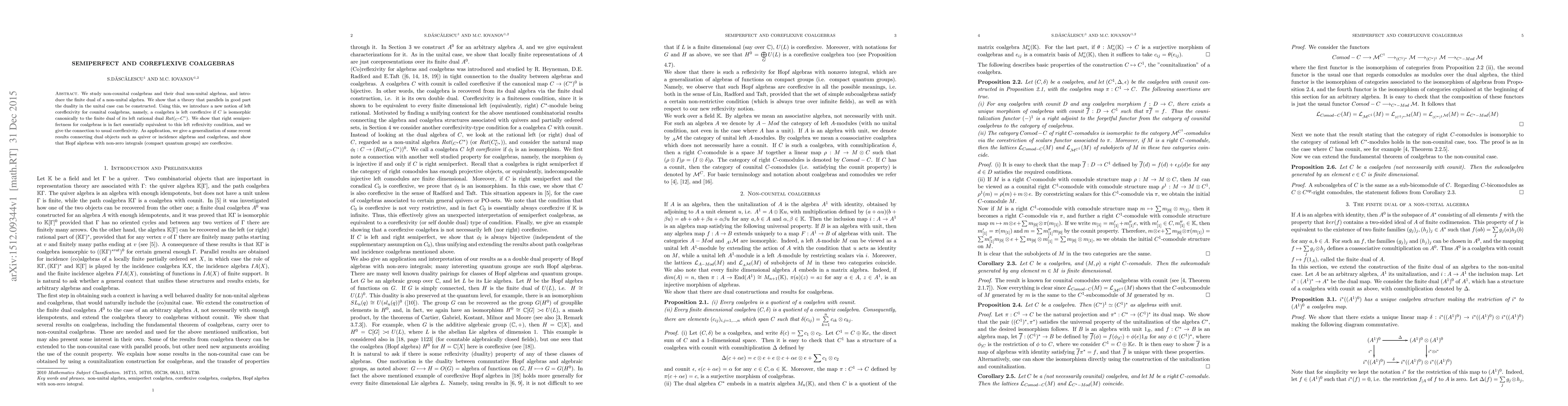 This paper explores non-counital coalgebras and their corresponding non-unital algebras, introducing the finite dual of non-unital algebras and establishing a theory paralleling unital duality. It defines left coreflexivity for coalgebras and demonstrates its equivalence to right semiperfectness, linking these concepts to usual coreflexivity and applying these notions to generalize recent results on dual objects like quiver and incidence algebras, and Hopf algebras with non-zero integrals.