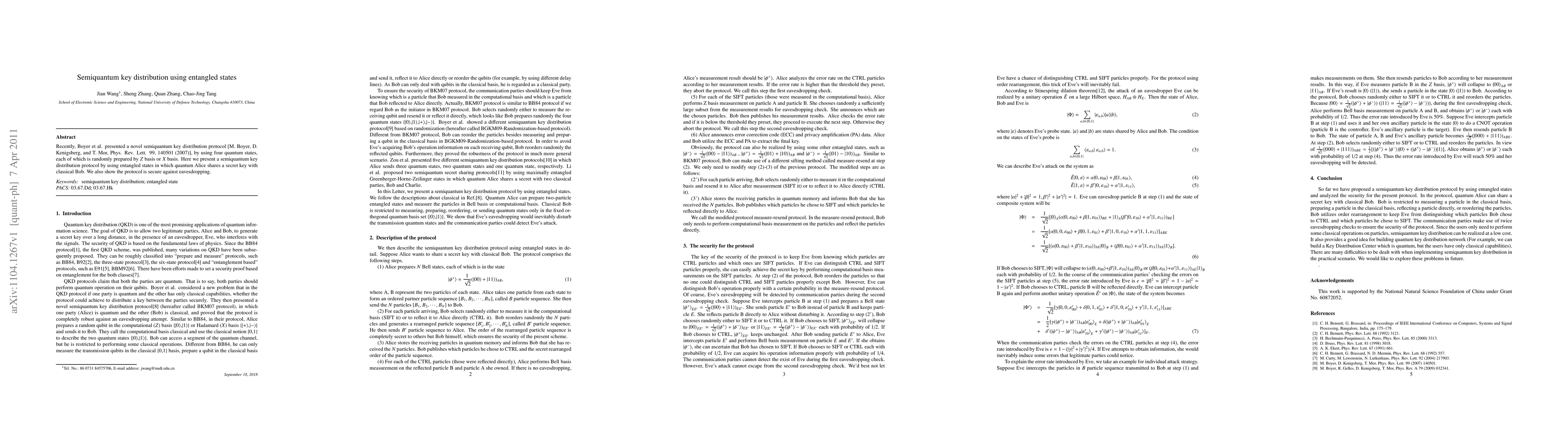 This paper proposes a semiquantum key distribution protocol using entangled states, allowing quantum Alice to securely share a secret key with classical Bob, and demonstrates the protocol's resistance against eavesdropping.