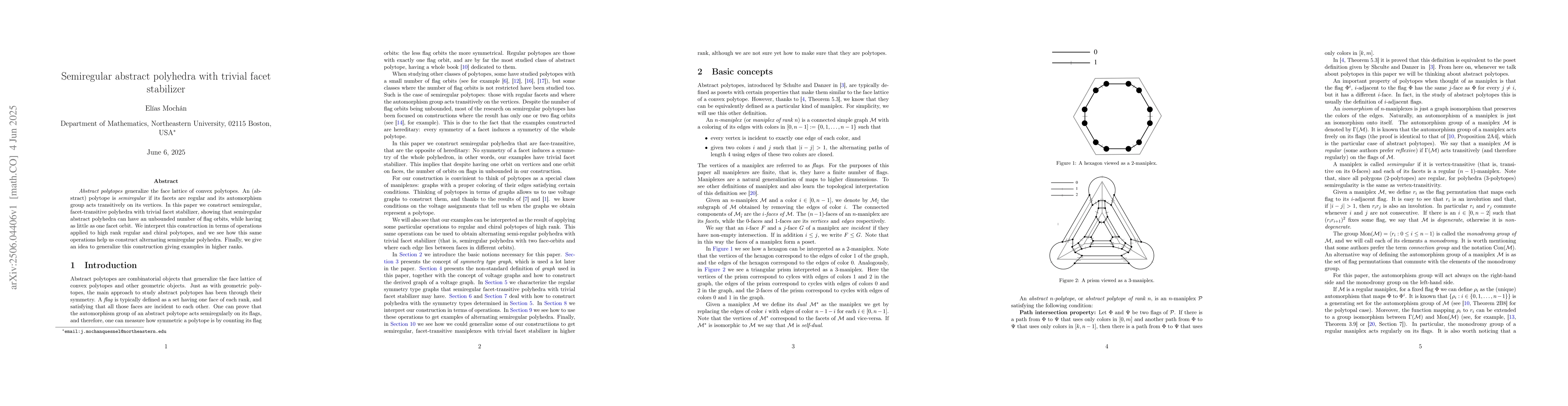 The novel construction of semiregular abstract polyhedra with trivial facet stabilizer and its interpretation through polytope operations.