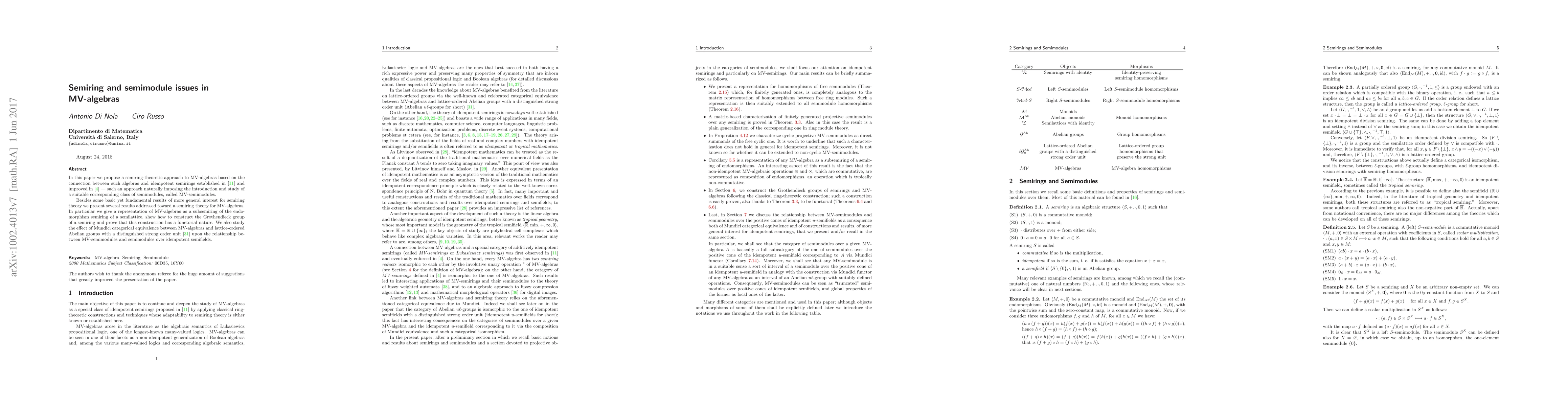 This paper introduces a semiring-theoretic framework for MV-algebras, linking them to idempotent semirings and exploring corresponding MV-semimodules. It presents a representation of MV-algebras within the endomorphism semiring of a semilattice, constructs the Grothendieck group of a semiring, and discusses the categorical equivalence between MV-algebras and lattice-ordered Abelian groups in relation to semimodules.