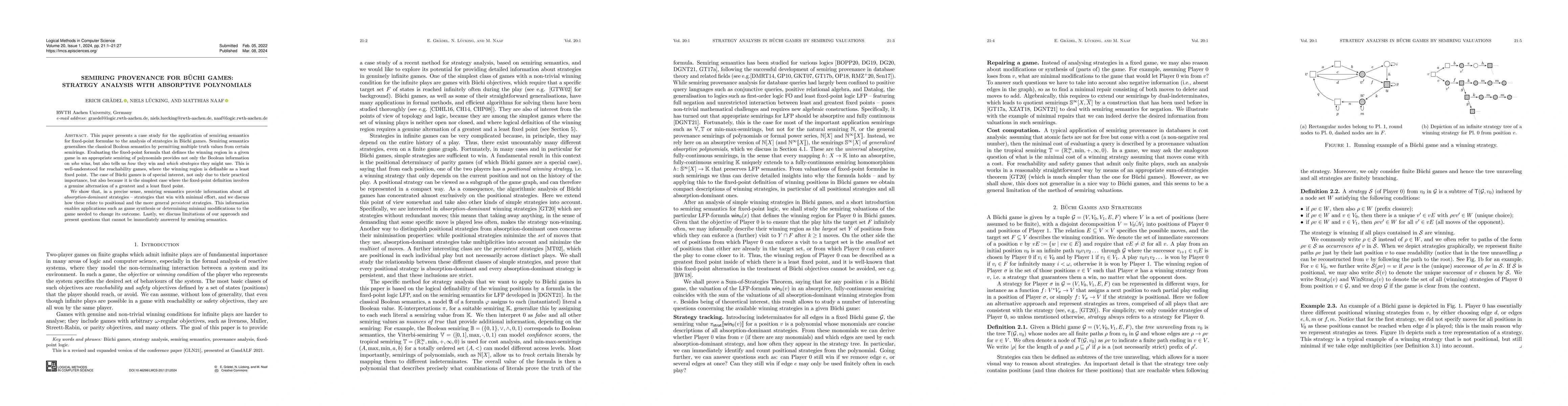 This paper presents a case study for the application of semiring semantics for fixed-point formulae to the analysis of strategies in B\"uchi games. Semiring semantics generalizes the classical Boolean semantics by permitting multiple truth values from certain semirings. Evaluating the fixed-point formula that defines the winning region in a given game in an appropriate semiring of polynomials provides not only the Boolean information on who wins, but also tells us how they win and which strategies they might use. This is well-understood for reachability games, where the winning region is definable as a least fixed point. The case of B\"uchi games is of special interest, not only due to their practical importance, but also because it is the simplest case where the fixed-point definition involves a genuine alternation of a greatest and a least fixed point. We show that, in a precise sense, semiring semantics provide information about all absorption-dominant strategies -- strategies that win with minimal effort, and we discuss how these relate to positional and the more general persistent strategies. This information enables applications such as game synthesis or determining minimal modifications to the game needed to change its outcome. Lastly, we discuss limitations of our approach and present questions that cannot be immediately answered by semiring semantics.
