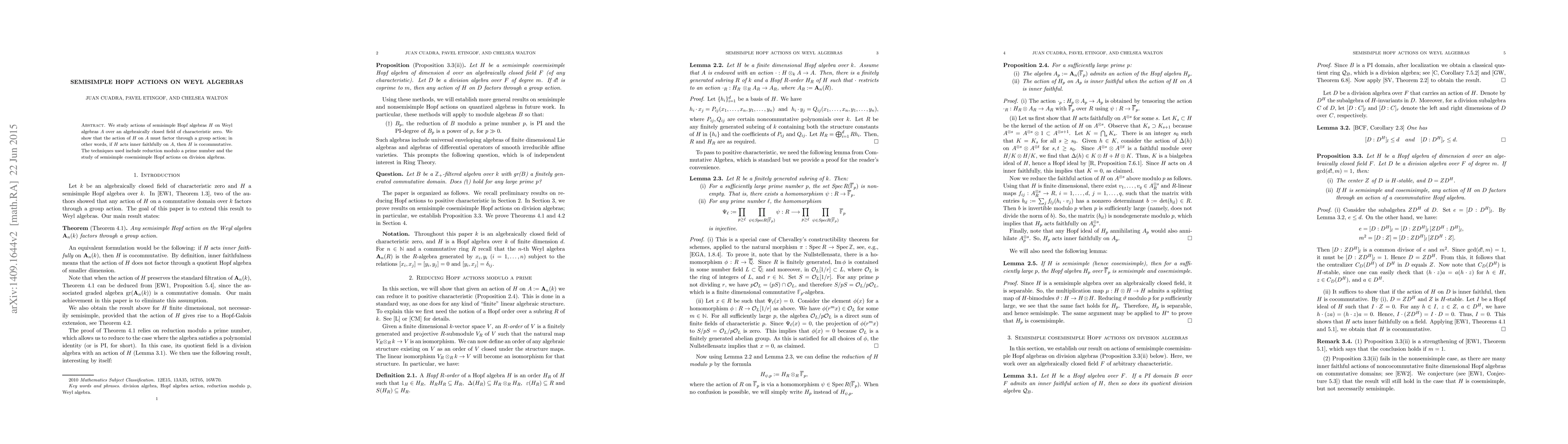 This paper investigates semisimple Hopf algebra actions on Weyl algebras over fields of characteristic zero, proving that such actions must pass through a group algebra, implying cocommutativity if the action is inner and faithful. Techniques involve reductions modulo primes and analysis of semisimple Hopf actions on division algebras.