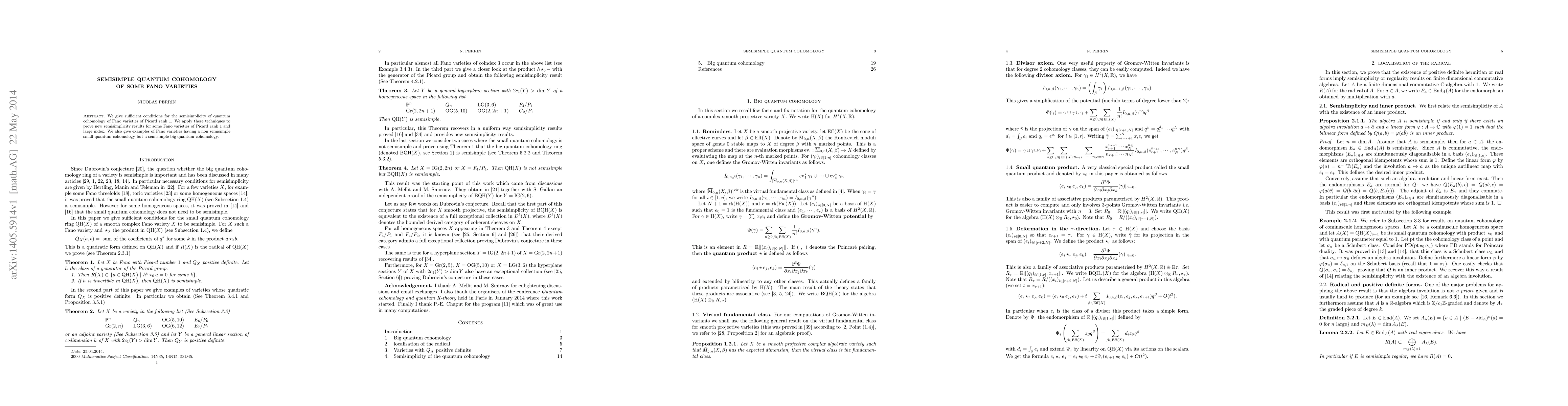 This paper establishes conditions for the semisimplicity of the quantum cohomology of Fano varieties with Picard rank 1, applies these to new semisimplicity results for specific high-index Fano varieties, and provides examples where small quantum cohomology is non-semisimple but big quantum cohomology remains semisimple.