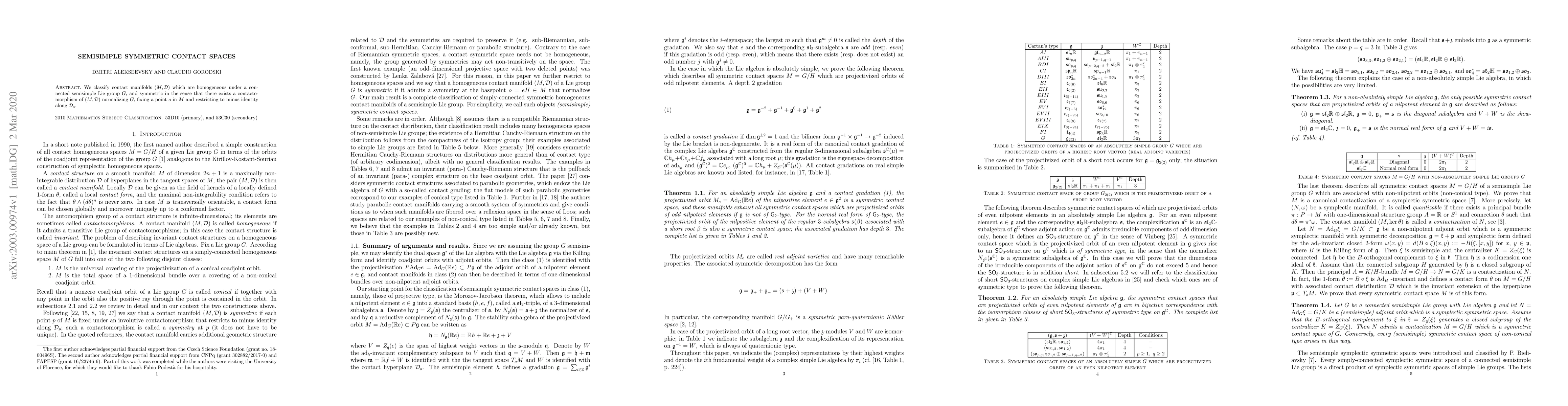 Researchers classify contact manifolds that are homogeneous under a connected semisimple Lie group, symmetric with a contactomorphism normalizing the group, and fixing a point, into a new category called semisimple symmetric contact spaces.