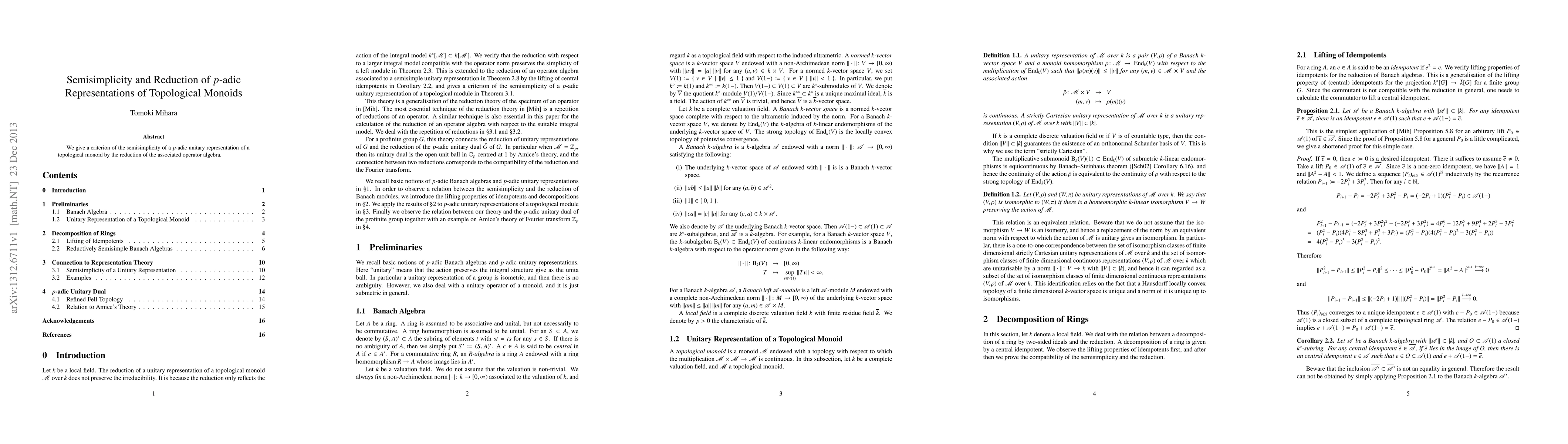 We give a criterion of the semisimplicity of a p-adic unitary representation of a topological monoid by the reduction of the associated operator algebra.