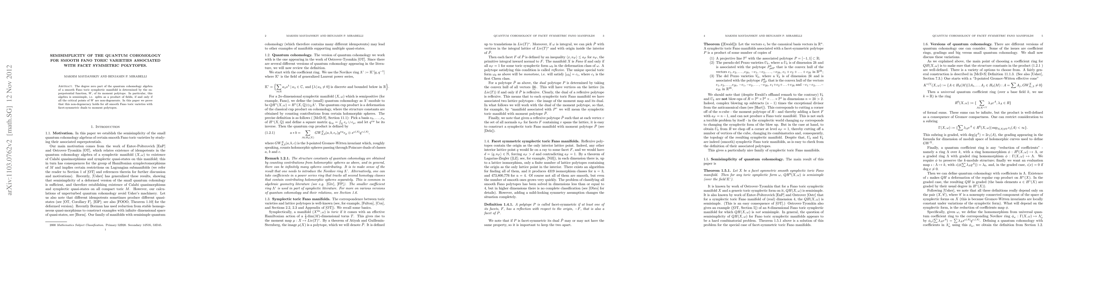 The degree zero part of the quantum cohomology algebra of a smooth Fano toric symplectic manifold is determined by the superpotential function, W, of its moment polytope. In particular, this algebra is semisimple, i.e. splits as a product of fields, if and only if all the critical points of W are non-degenerate. In this paper we prove that this non-degeneracy holds for all smooth Fano toric varieties with facet-symmetric duals to moment polytopes.