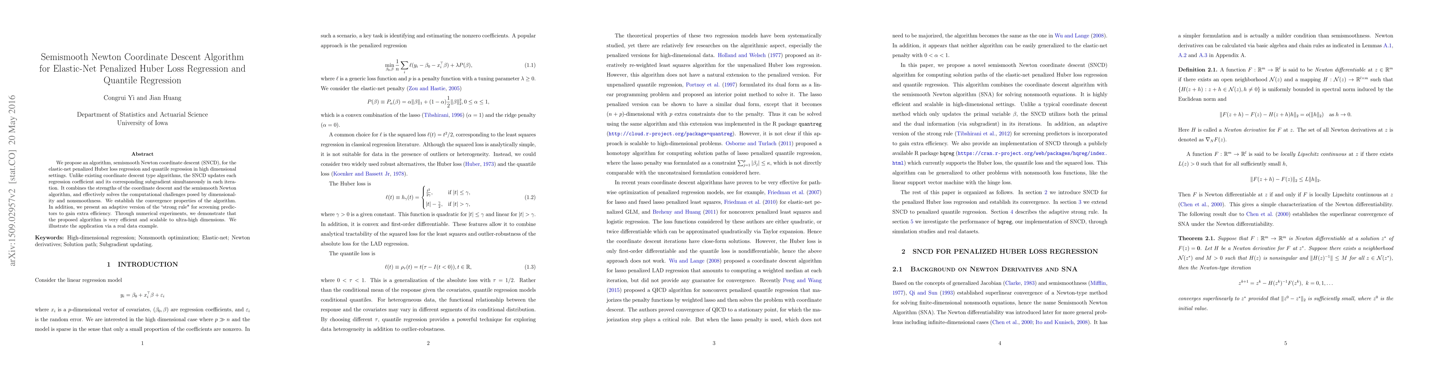 The paper proposes a semismooth Newton coordinate descent (SNCD) algorithm for elastic-net penalized Huber loss regression and quantile regression, which efficiently updates regression coefficients and their subgradients simultaneously. The algorithm combines coordinate descent and semismooth Newton methods to address high dimensionality and nonsmoothness, demonstrating strong convergence properties and scalability through numerical experiments and a real data example.
