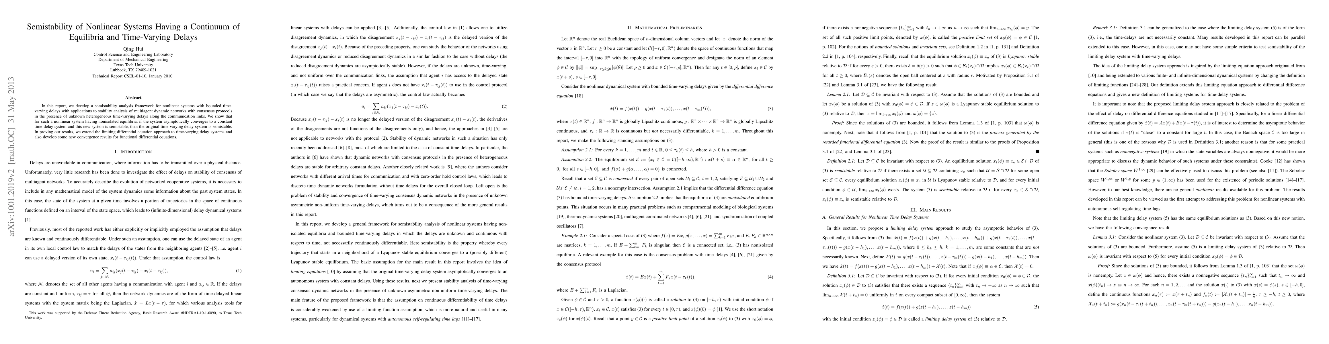 In this report, we develop a semistability analysis framework for nonlinear systems with bounded time-varying delays with applications to stability analysis of multiagent dynamic networks with consensus protocols in the presence of unknown heterogeneous time-varying delays along the communication links. We show that for such a nonlinear system having nonisolated equilibria, if the system asymptotically converges to a constant time-delay system and this new system is semistable, then the original time-varying delay system is semistable. In proving our results, we extend the limiting differential equation approach to time-varying delay systems and also develop some new convergence results for functional differential equations.