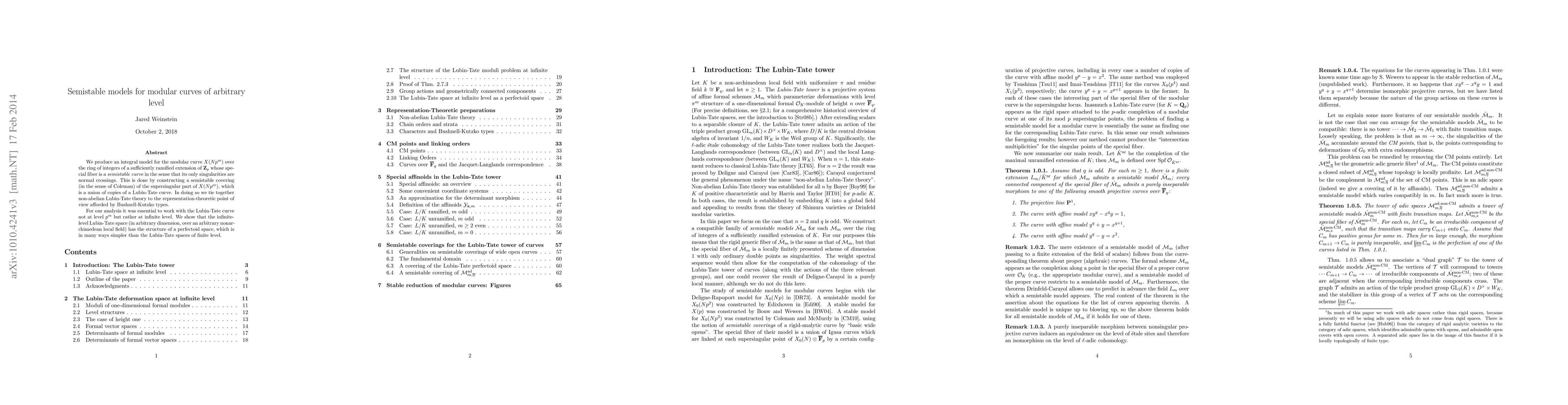 We produce an integral model for the modular curve $X(Np^m)$ over the ring of integers of a sufficiently ramified extension of $\mathbf{Z}_p$ whose special fiber is a {\em semistable curve} in the sense that its only singularities are normal crossings. This is done by constructing a semistable covering (in the sense of Coleman) of the supersingular part of $X(Np^m)$, which is a union of copies of a Lubin-Tate curve. In doing so we tie together nonabelian Lubin-Tate theory to the representation-theoretic point of view afforded by Bushnell-Kutzko types. For our analysis it was essential to work with the Lubin-Tate curve not at level $p^m$ but rather at infinite level. We show that the infinite-level Lubin-Tate space (in arbitrary dimension, over an arbitrary nonarchimedean local field) has the structure of a perfectoid space, which is in many ways simpler than the Lubin-Tate spaces of finite level.
