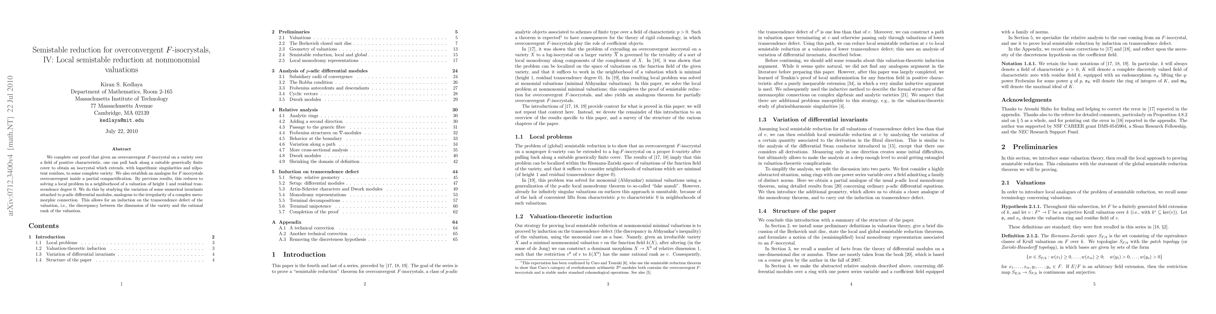 This paper completes the proof for local semistable reduction of overconvergent F-isocrystals, extending them with logarithmic singularities and nilpotent residues to a complete variety via a generically finite cover. The study involves analyzing numerical invariants of p-adic differential modules to resolve a local problem in the neighborhood of a nonmonomial valuation of height 1 and transcendence degree 0.
